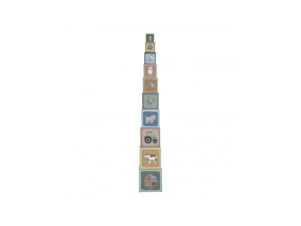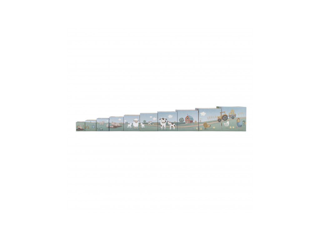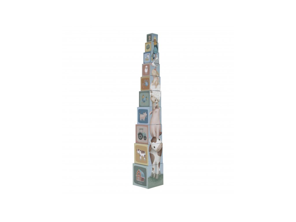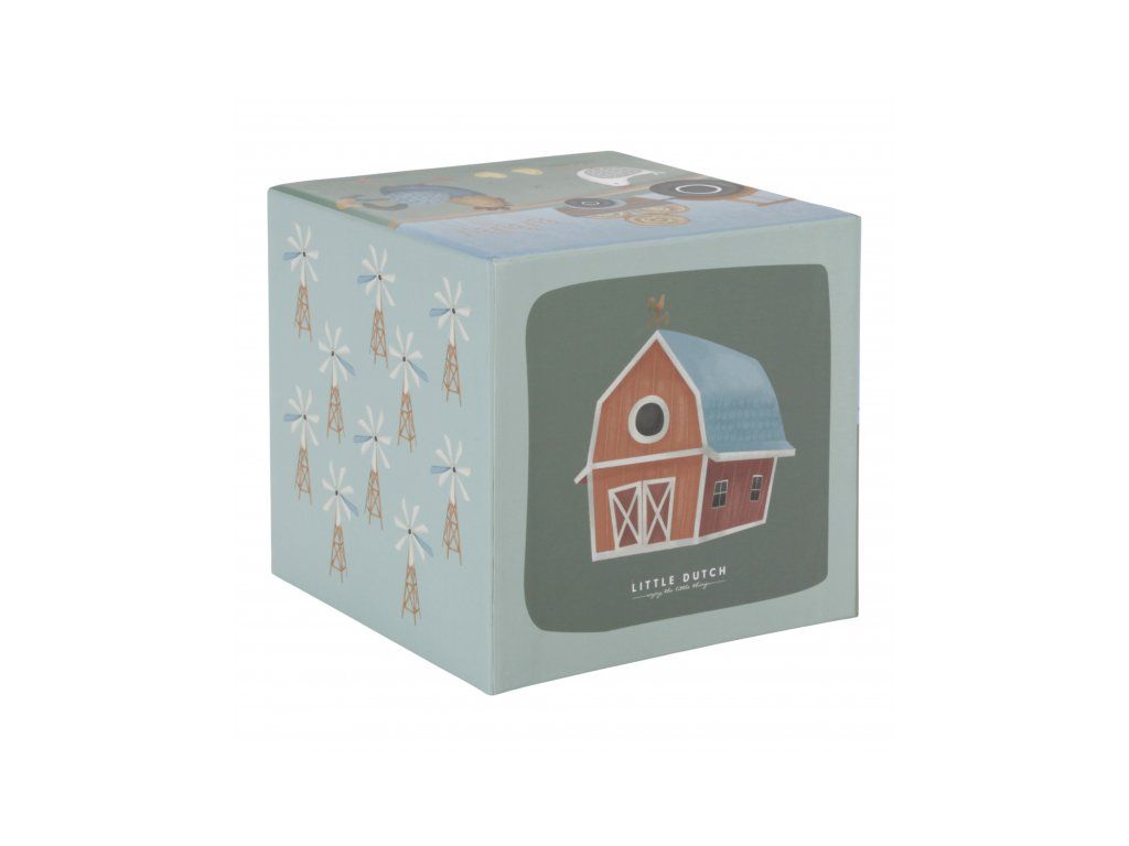 Farebné kartónové kocky s krásnymi ilustráciami motivov zo života na farme. Nechajte vaše dieťa kocky skladať na seba do vysokej veže alebo vedľa seba podľa veľkosti. V staršom veku sa dieťa s pomocou očíslovaných kociek môže hravým spôsobom učiť počítať aj rozpoznávať číslice.