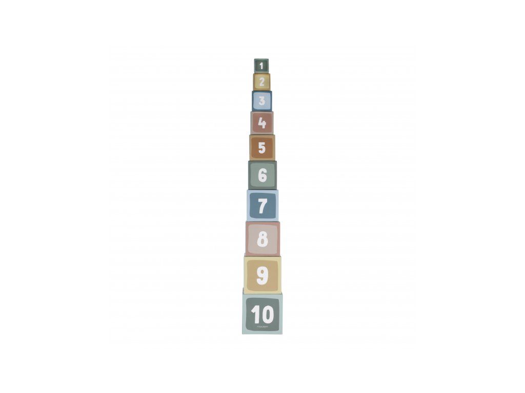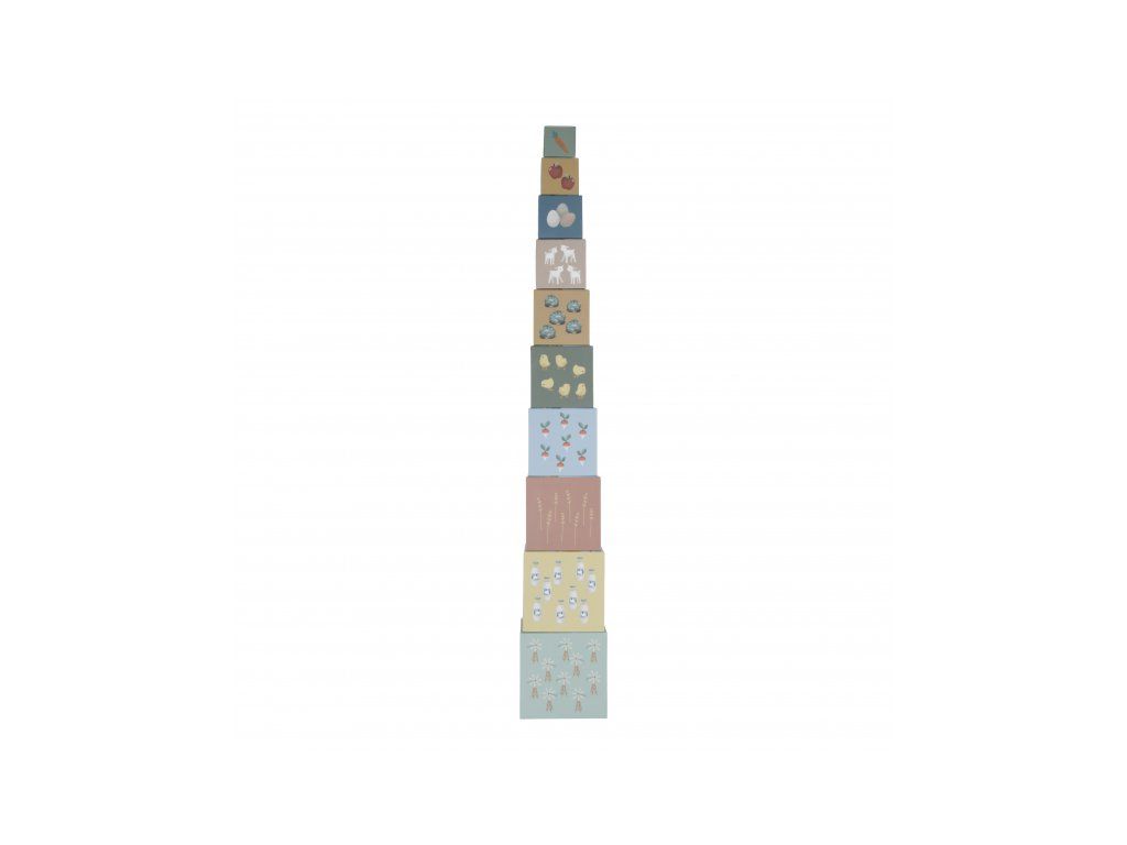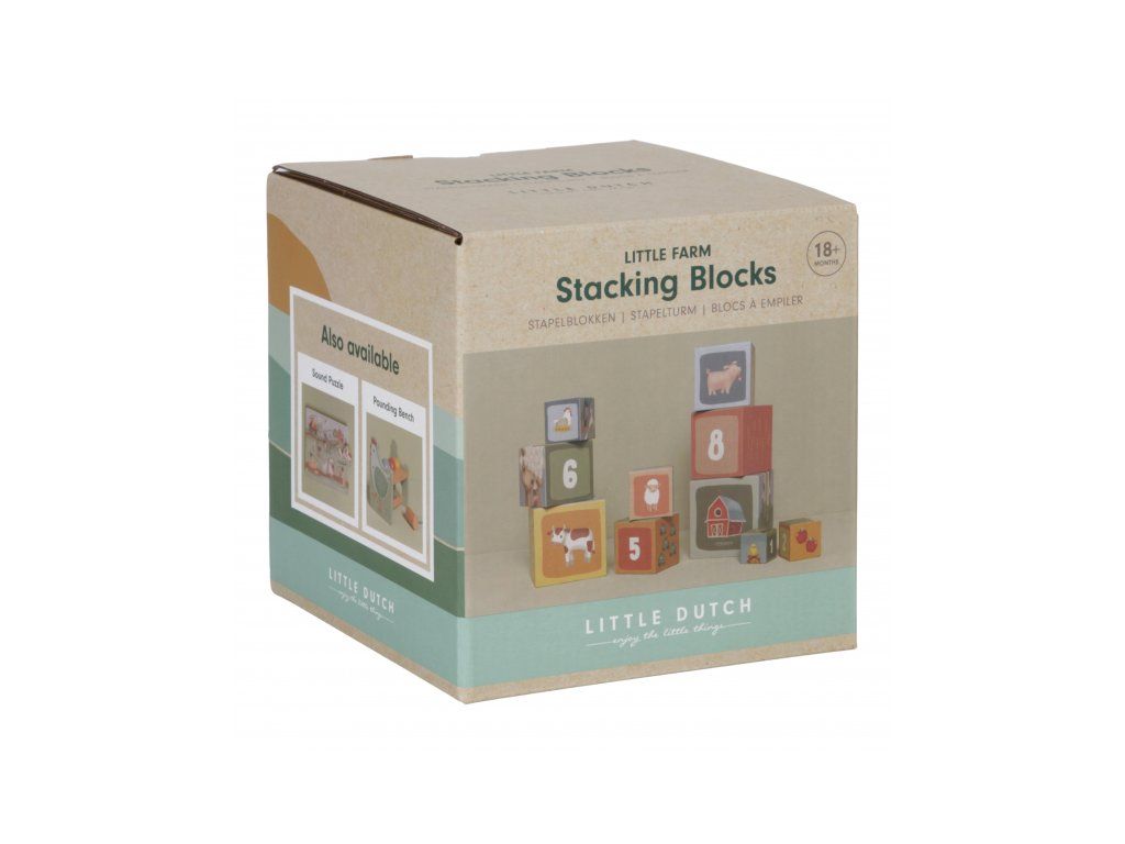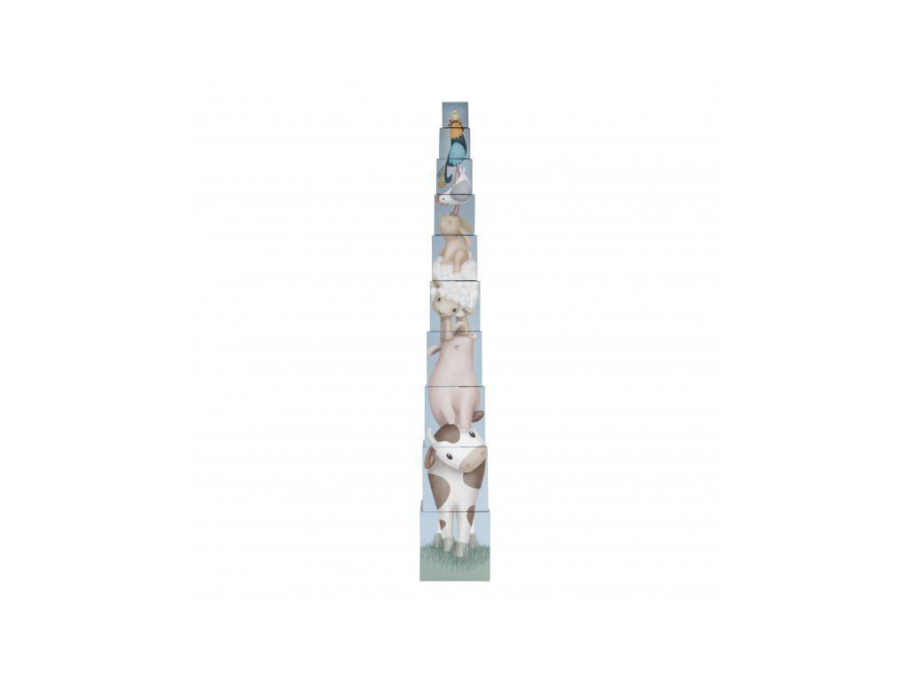 Farebné kartónové kocky s krásnymi ilustráciami motivov zo života na farme. Nechajte vaše dieťa kocky skladať na seba do vysokej veže alebo vedľa seba podľa veľkosti. V staršom veku sa dieťa s pomocou očíslovaných kociek môže hravým spôsobom učiť počítať aj rozpoznávať číslice.