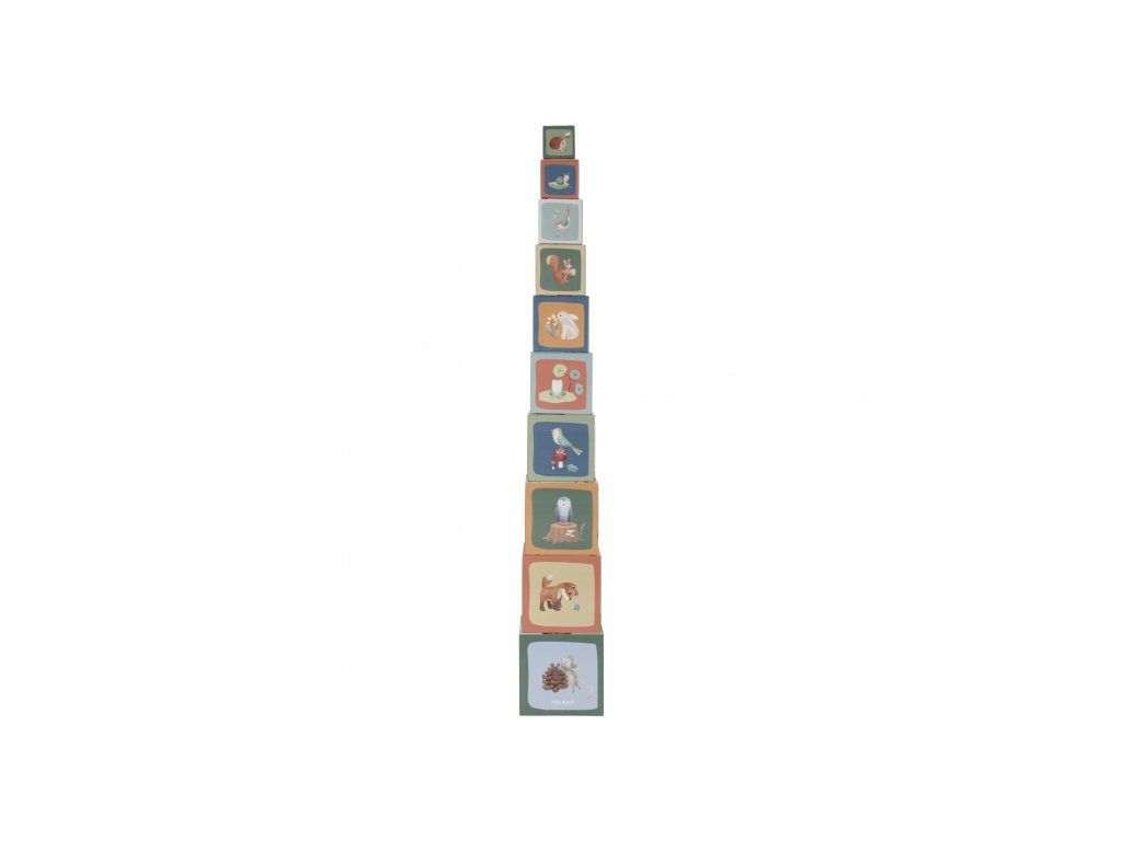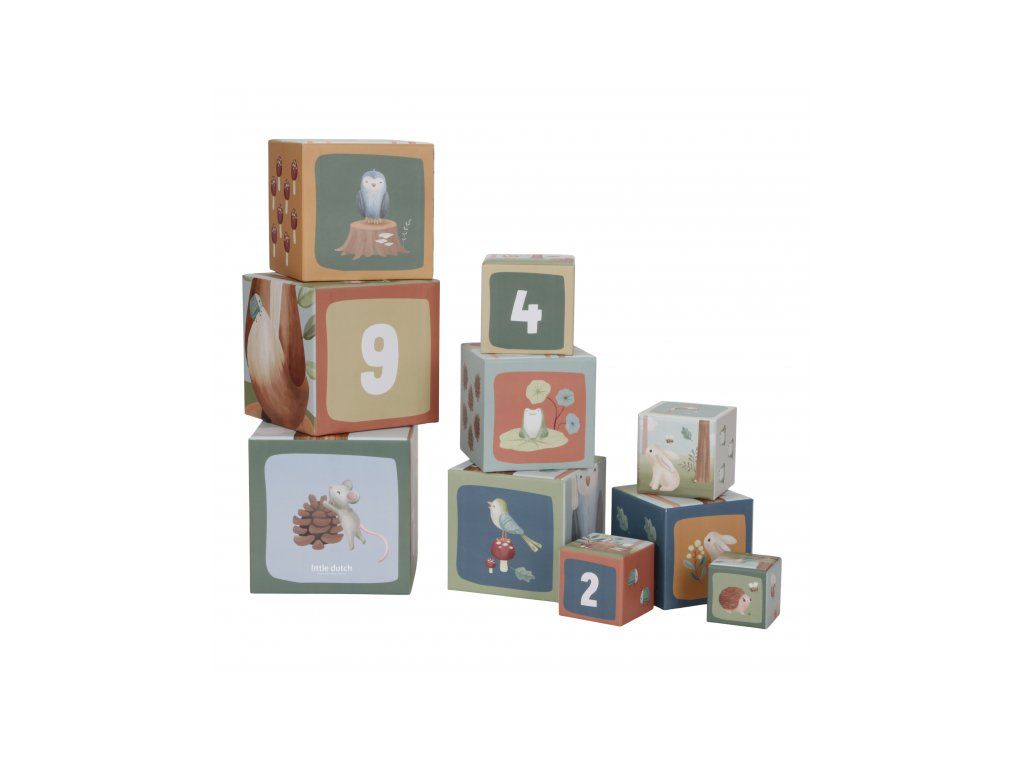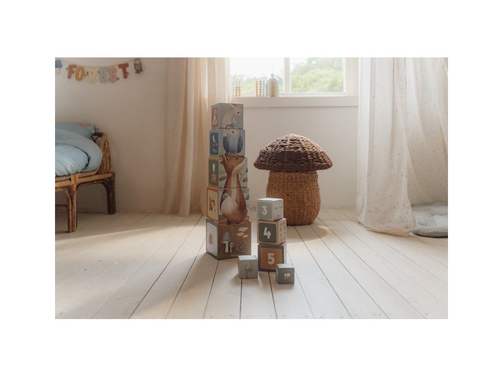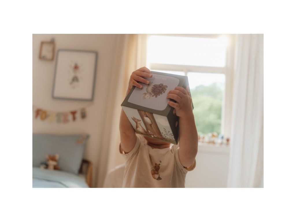Farebné kartónové kocky s krásnymi ilustráciami motivov zo života v lese. Nechajte vaše dieťa kocky skladať na seba do vysokej veže alebo vedľa seba podľa veľkosti. V staršom veku sa dieťa s pomocou očíslovaných kociek môže hravým spôsobom učiť počítať aj rozpoznávať číslice.