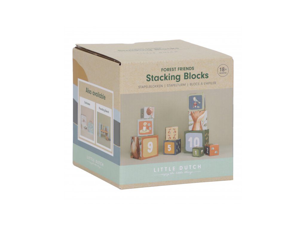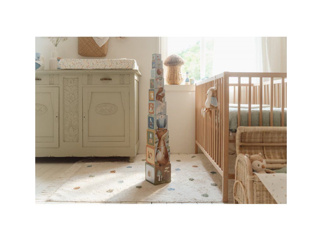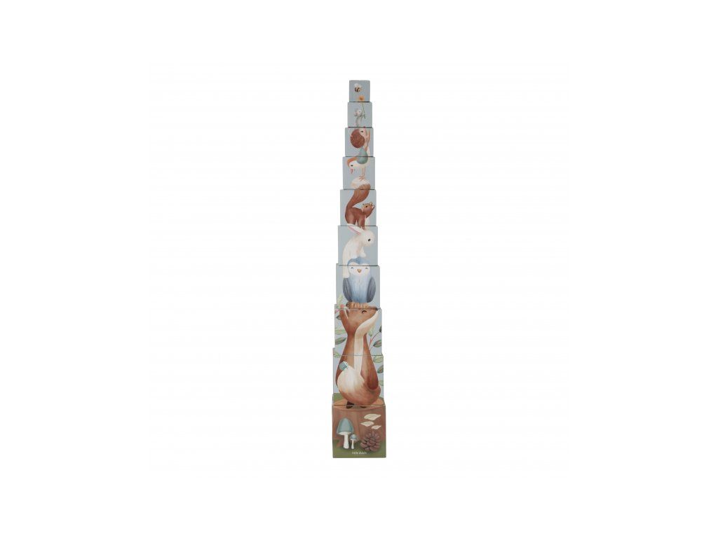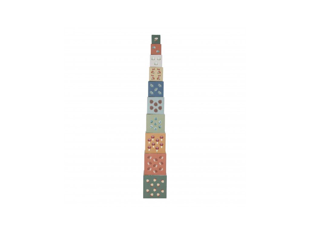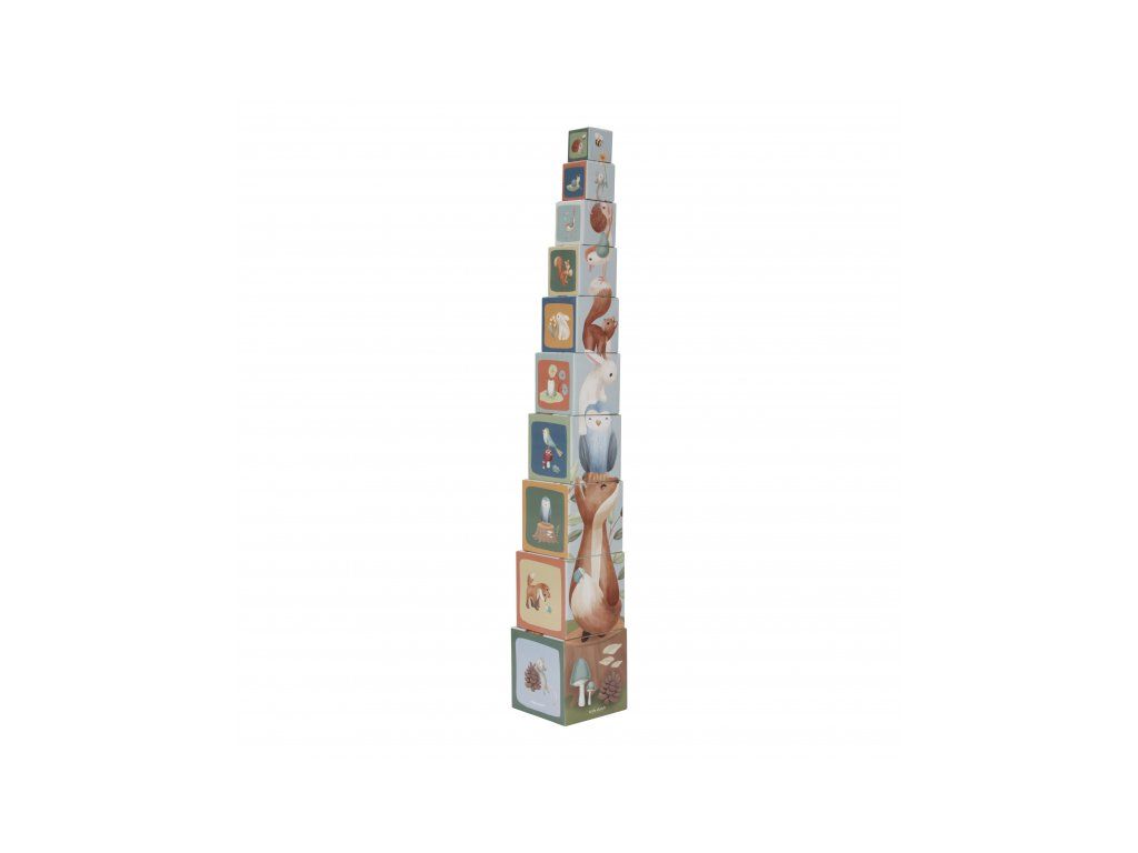Farebné kartónové kocky s krásnymi ilustráciami motivov zo života v lese. Nechajte vaše dieťa kocky skladať na seba do vysokej veže alebo vedľa seba podľa veľkosti. V staršom veku sa dieťa s pomocou očíslovaných kociek môže hravým spôsobom učiť počítať aj rozpoznávať číslice.