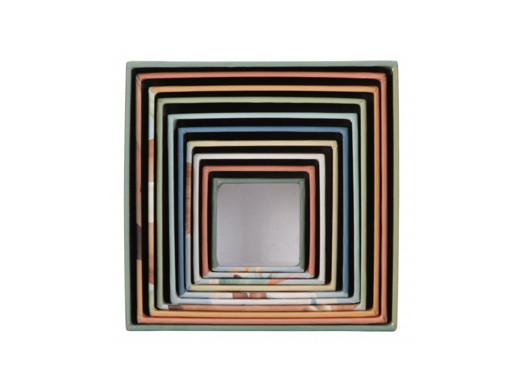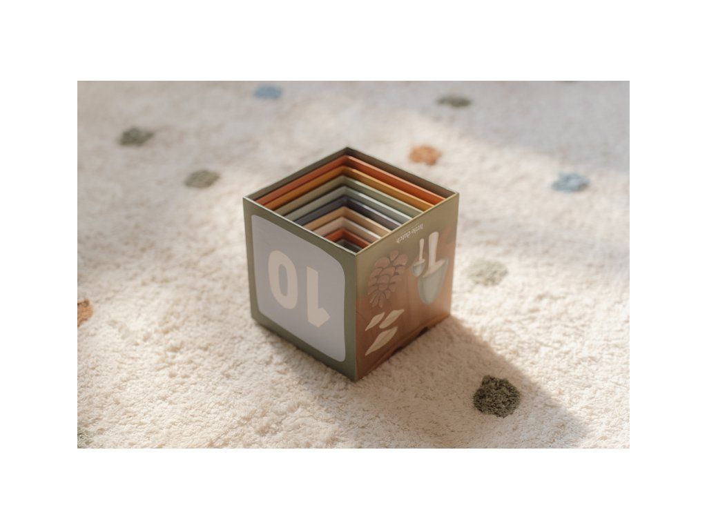 Najmenšia kocka má 5 cm a najväčšia má 14 cm. Po skončení hrania kocky ľahko uložíte zložením do seba.