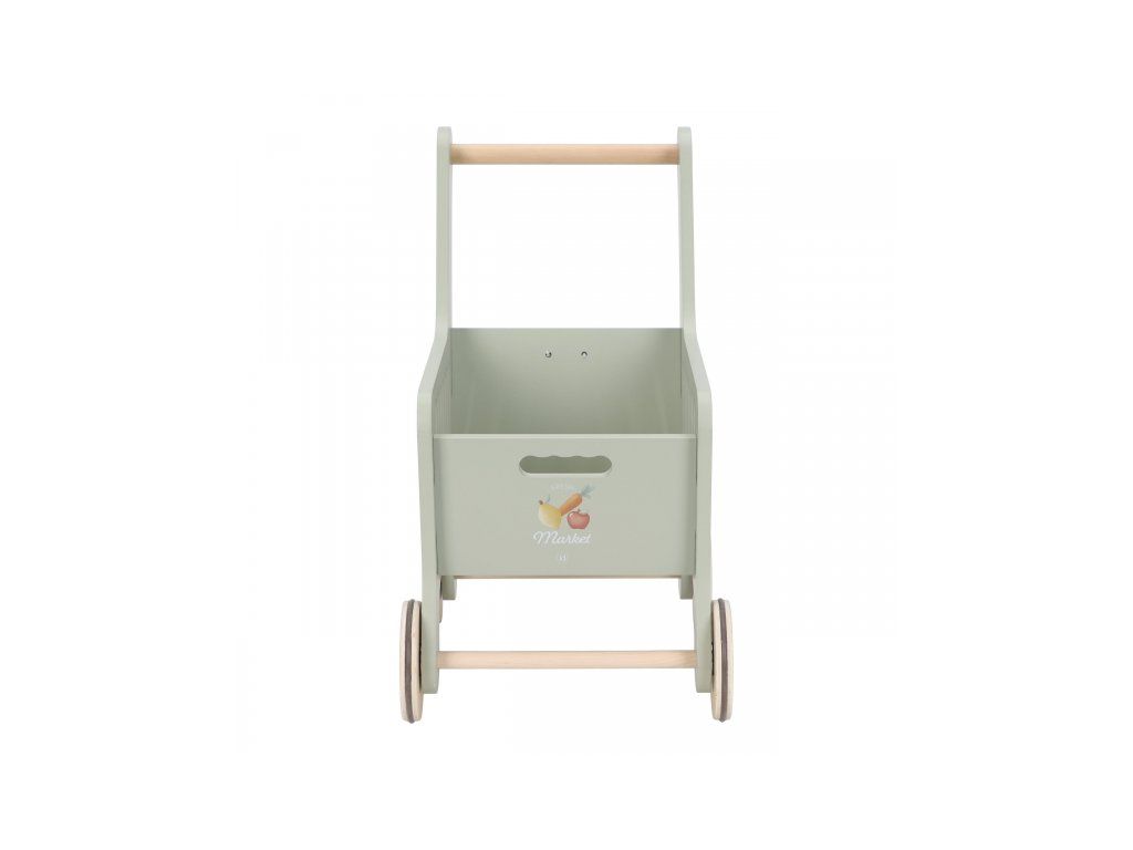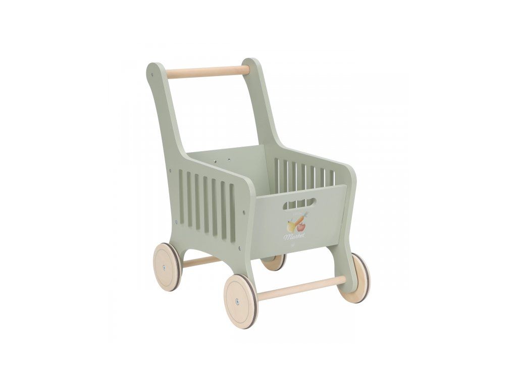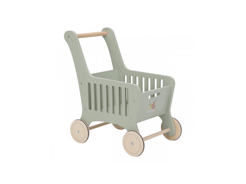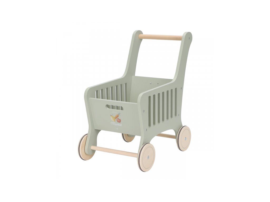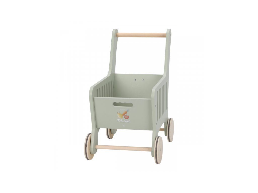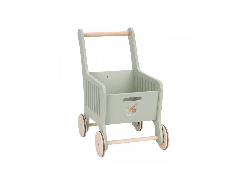 Vozík je vyrobený z odolného dreva v jemnom zelenom odtieni a je vybavený štyrmi hladko sa otáčajúcimi kolieskami a širokou rukoväťou, ktorá zaisťuje stabilné a pohodlné držanie aj pre tých najmenších. Vďaka priestornému úložnému priestoru sa do neho zmestí množstvo nákupov.
