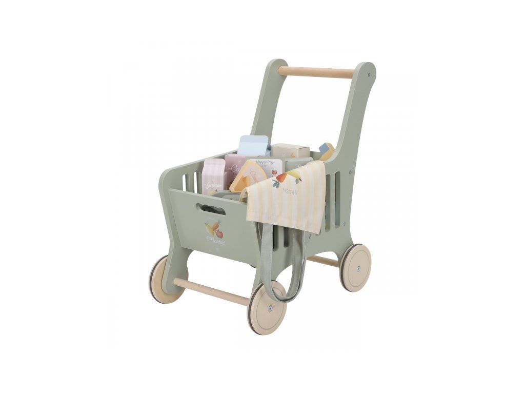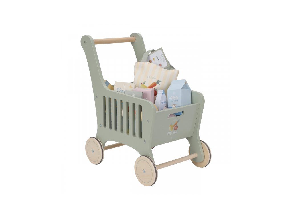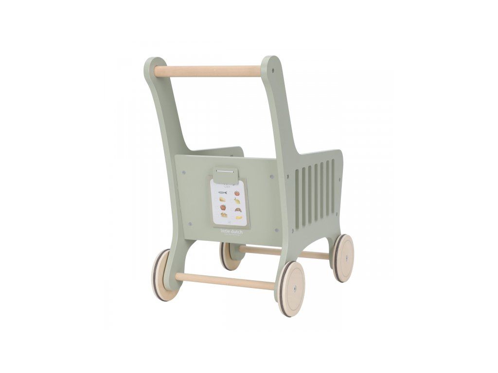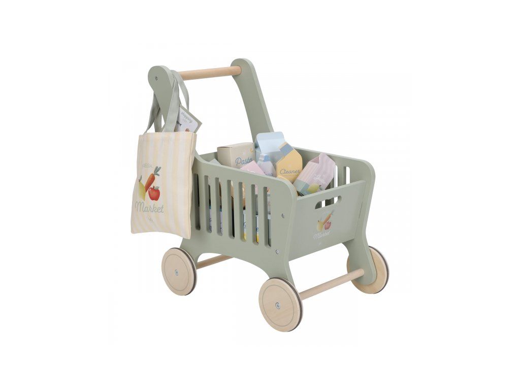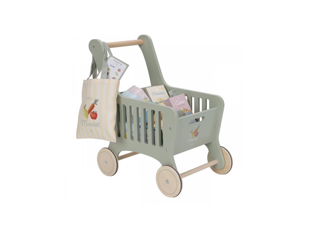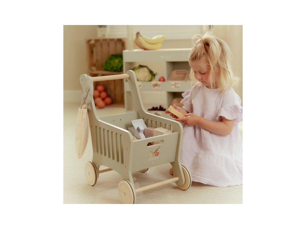 Vozík je vyrobený z odolného dreva v jemnom zelenom odtieni a je vybavený štyrmi hladko sa otáčajúcimi kolieskami a širokou rukoväťou, ktorá zaisťuje stabilné a pohodlné držanie aj pre tých najmenších. Vďaka priestornému úložnému priestoru sa do neho zmestí množstvo nákupov.