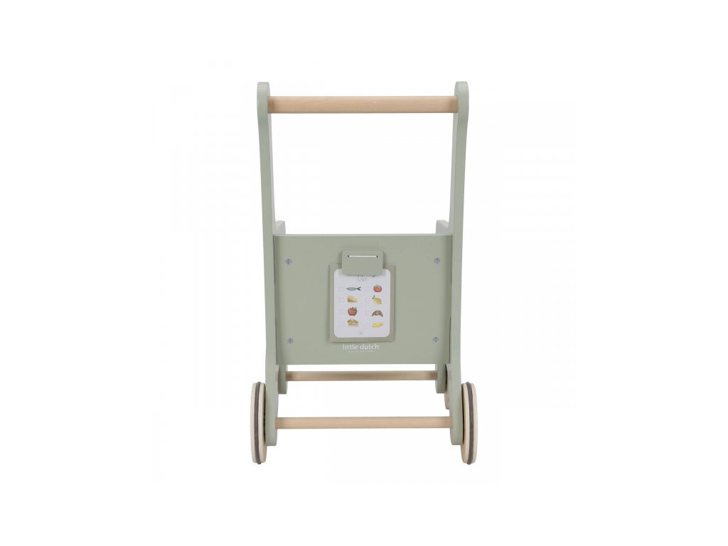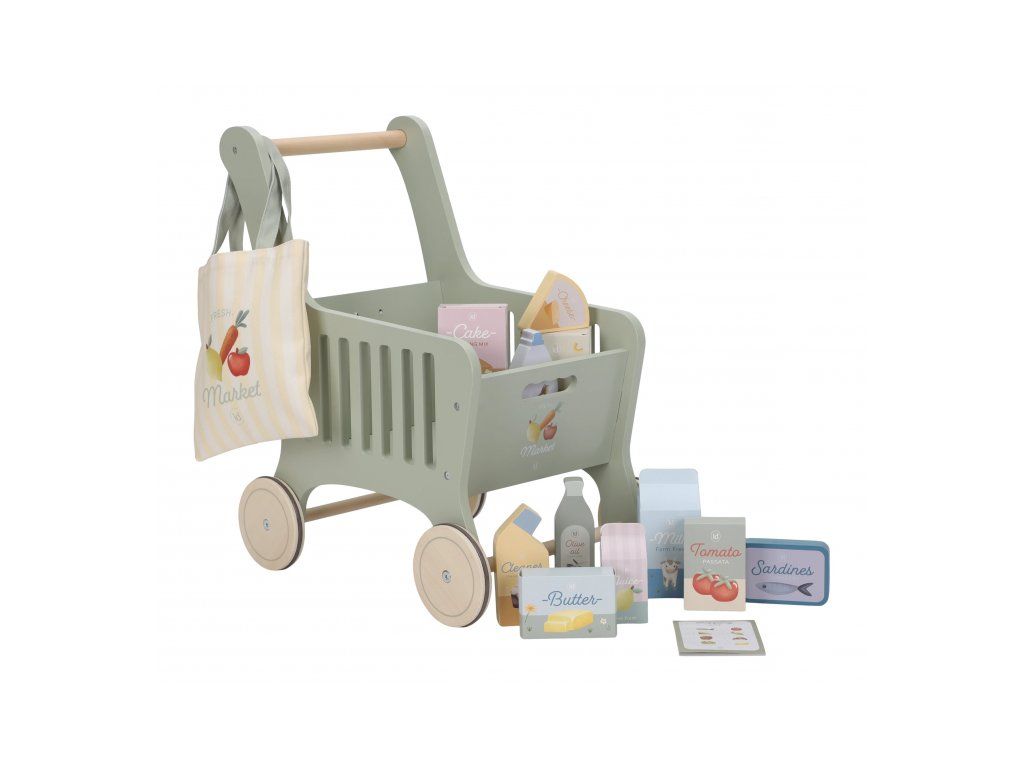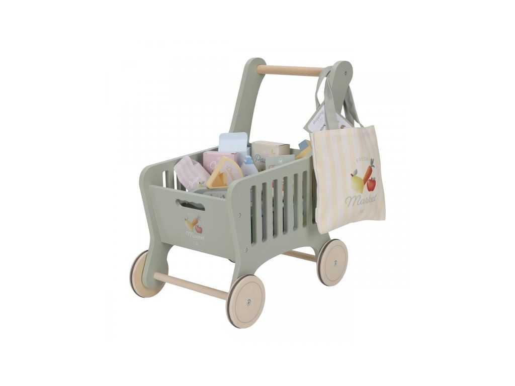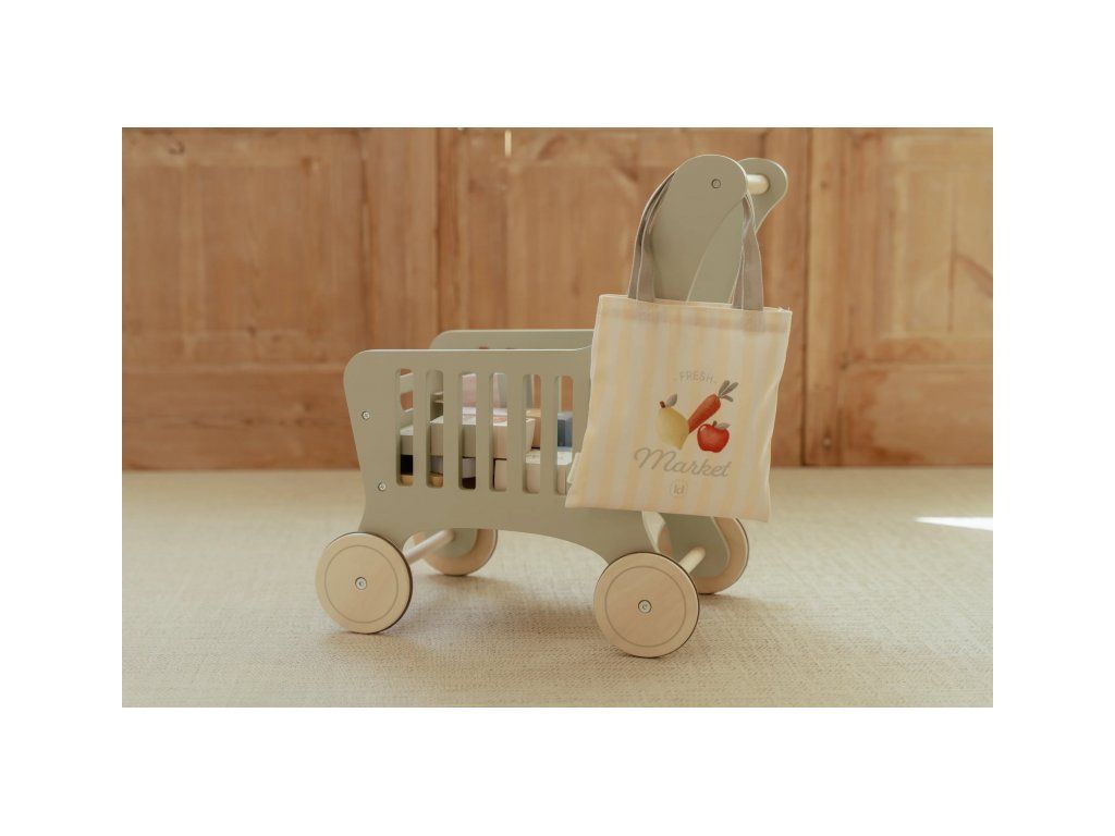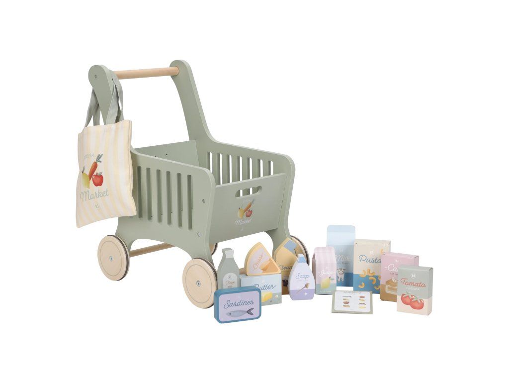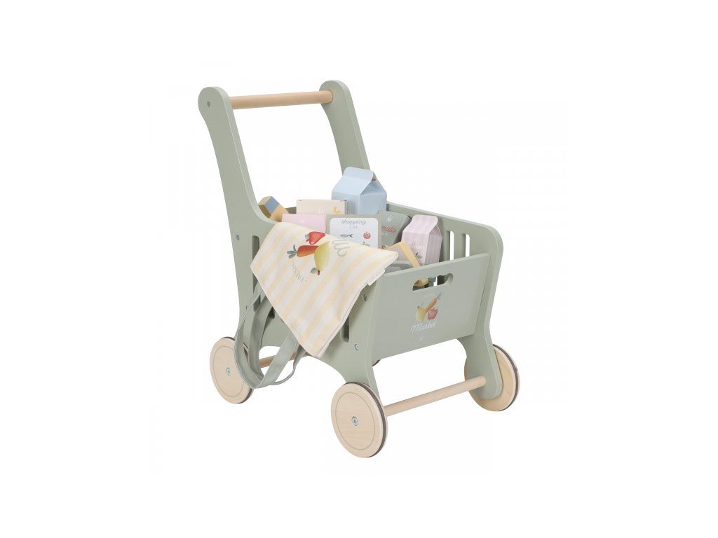 Vozík je vyrobený z odolného dreva v jemnom zelenom odtieni a je vybavený štyrmi hladko sa otáčajúcimi kolieskami a širokou rukoväťou, ktorá zaisťuje stabilné a pohodlné držanie aj pre tých najmenších. Vďaka priestornému úložnému priestoru sa do neho zmestí množstvo nákupov.