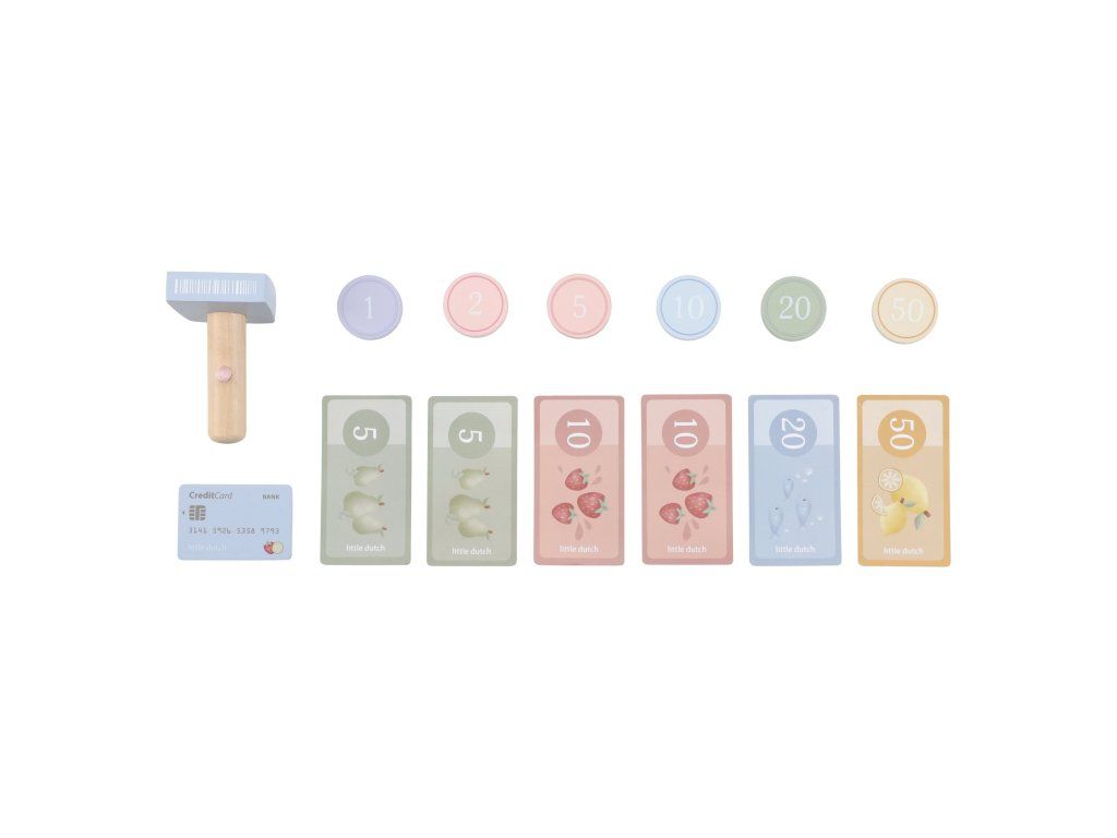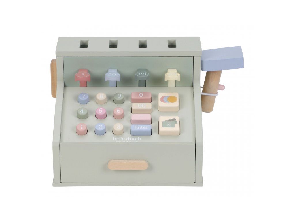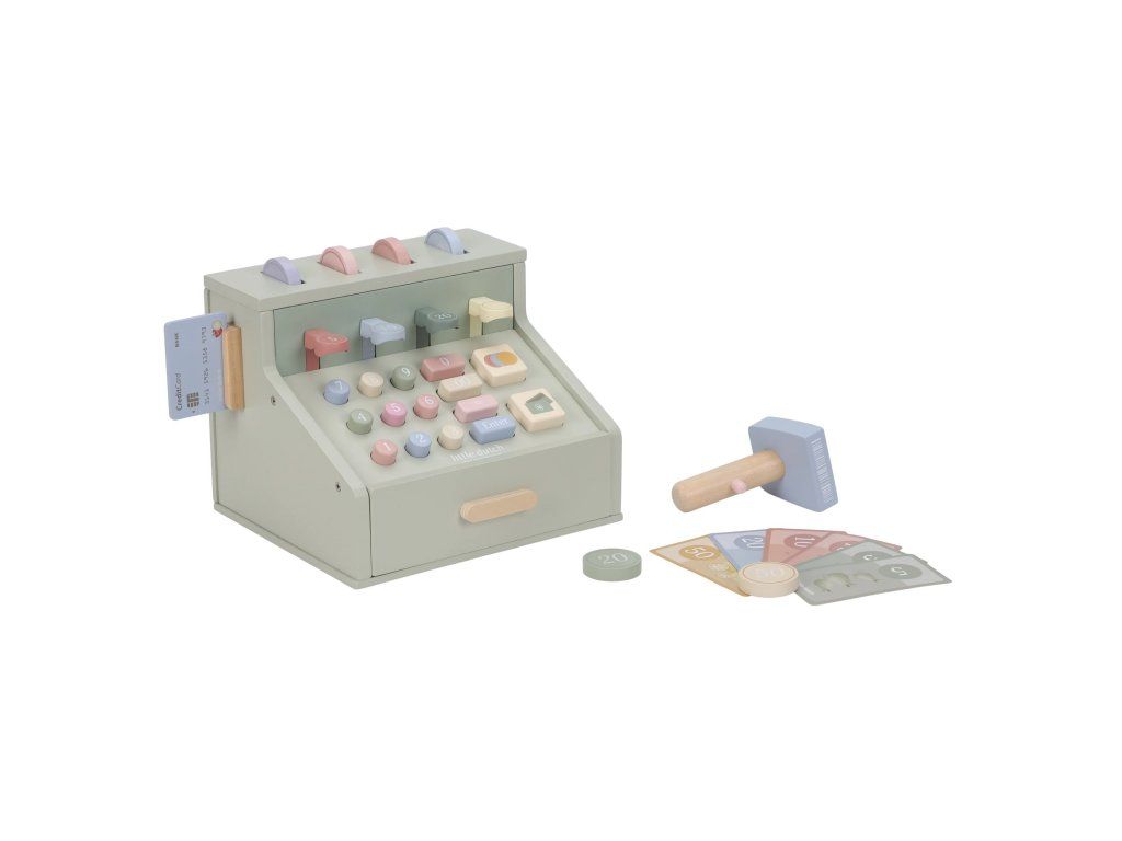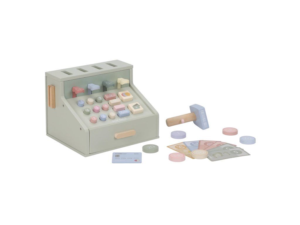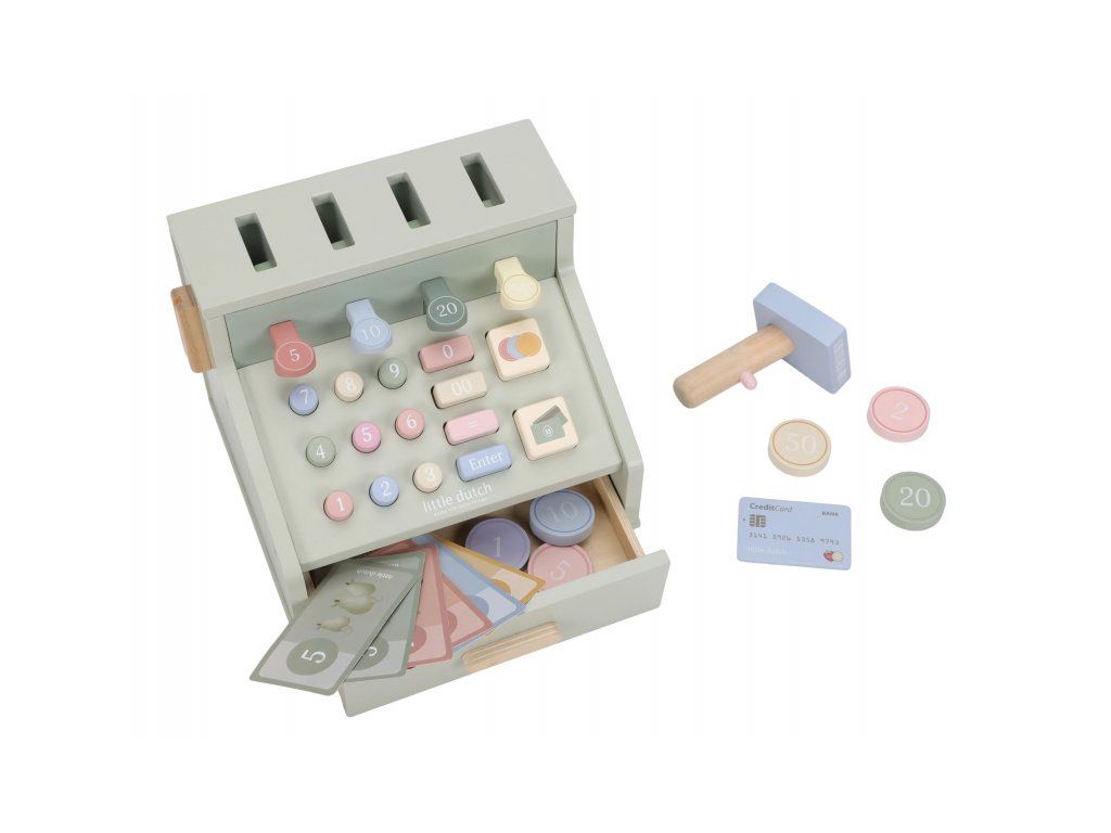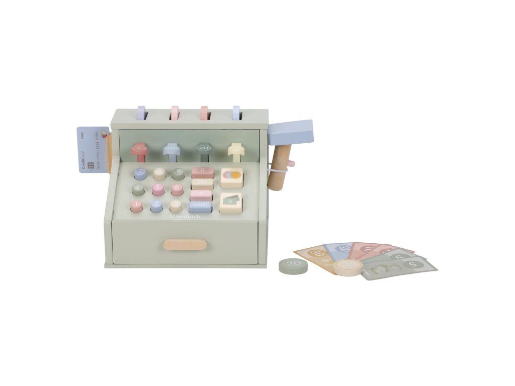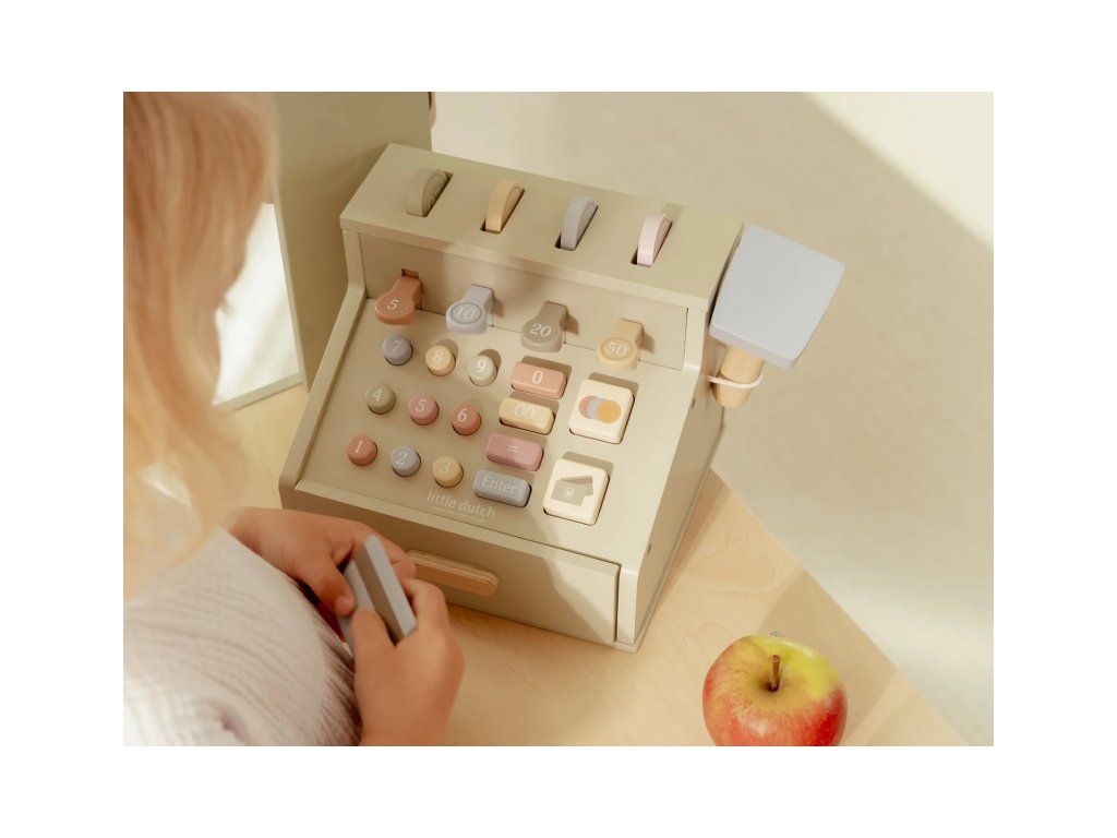 Počítaj, skenuj a blokuj! S touto krásnou drevenou pokladňou bude hra na obchod ešte zábavnejšia a realistickejšia. Pokladňa je vybavená skenerom, čítačkou kariet, tlačidlami a zásuvkou na mince a bankovky. Súčasťou je aj platobná karta, takže malí predavači môžu prijímať hotovosť aj bezkontaktné platby.