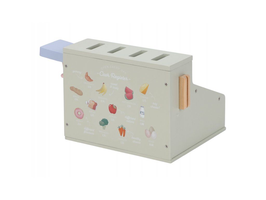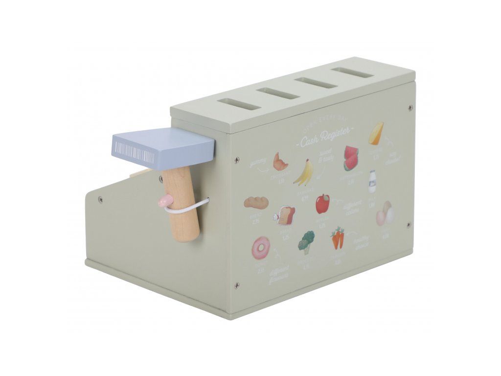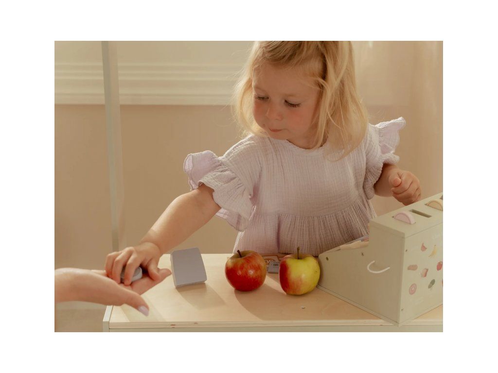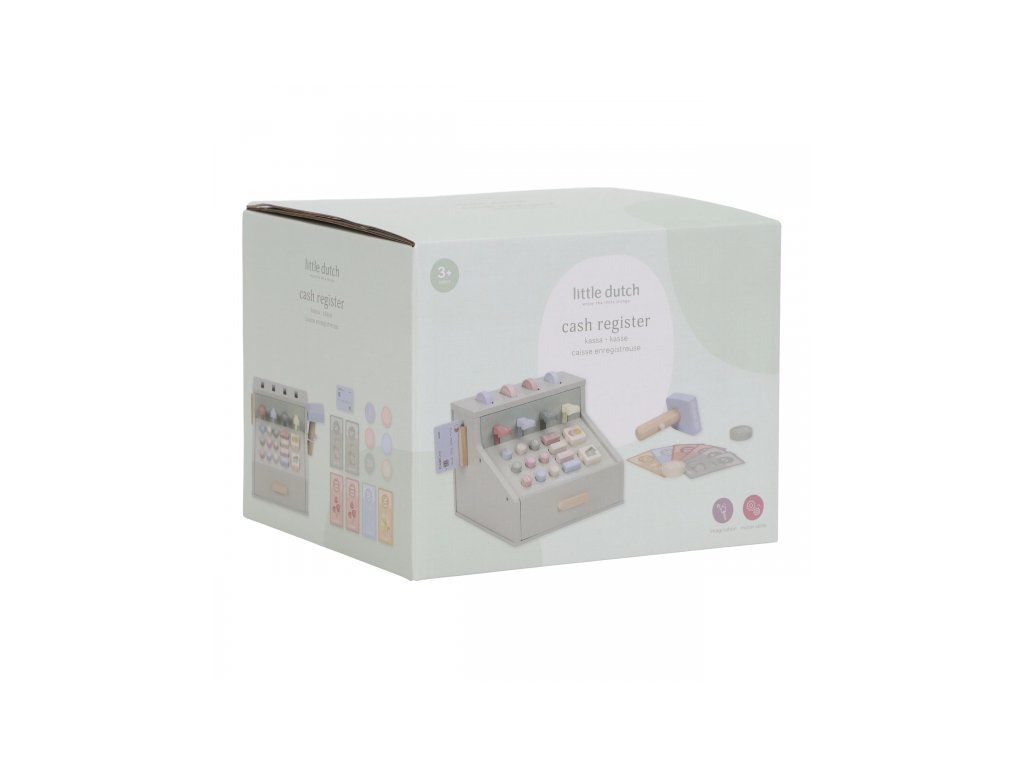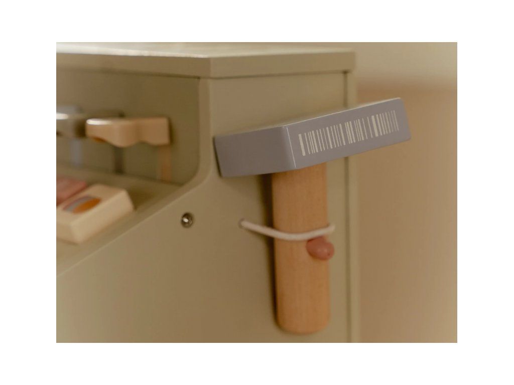 Deti si môžu precvičiť základné počty a rozvíjať finančnú gramotnosť hrou, zatiaľ čo obsluhujú zákazníkov, skenujú tovar a vystavujú účtenky. Ideálny doplnok k ďalším dreveným herným sadám, ako je kávovar, čajová súprava alebo detský obchodík.