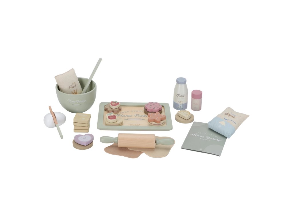 Sada obsahuje všetko potrebné na pečenie: kartičku s receptom, drevené suroviny ako vajcia, maslo, múku, cukor, mlieko, farebné posypky ak tomu misu na miešanie, valček, tácku a doplnky na zdobenie. Nechýbajú ani hotové kúsky cukroviniek a plát cesta z plsti, ktorý si môžu deti rozváľať a nazdobiť podľa vlastnej fantázie.