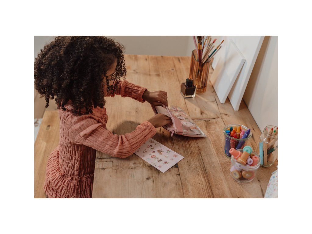 Sada výtvarných potrieb v krásnom prevedení s motívmi na záhrade v lese obsahuje priehľadné puzdro na zips, zošit, samolepky, pravítko, gumu, strúhadlo a šablóny.
