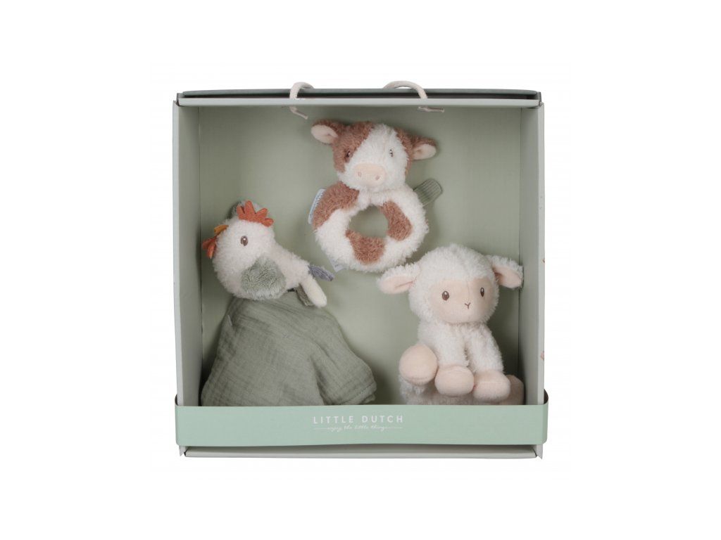 Krásna darčeková sada plyšových hračiek je ideálna ako darček pre novonarodené bábätko. Sada obsahuje hrkálku v podobe kravičky, maznáčika so sliepočkou a plyšovou ovečkou.