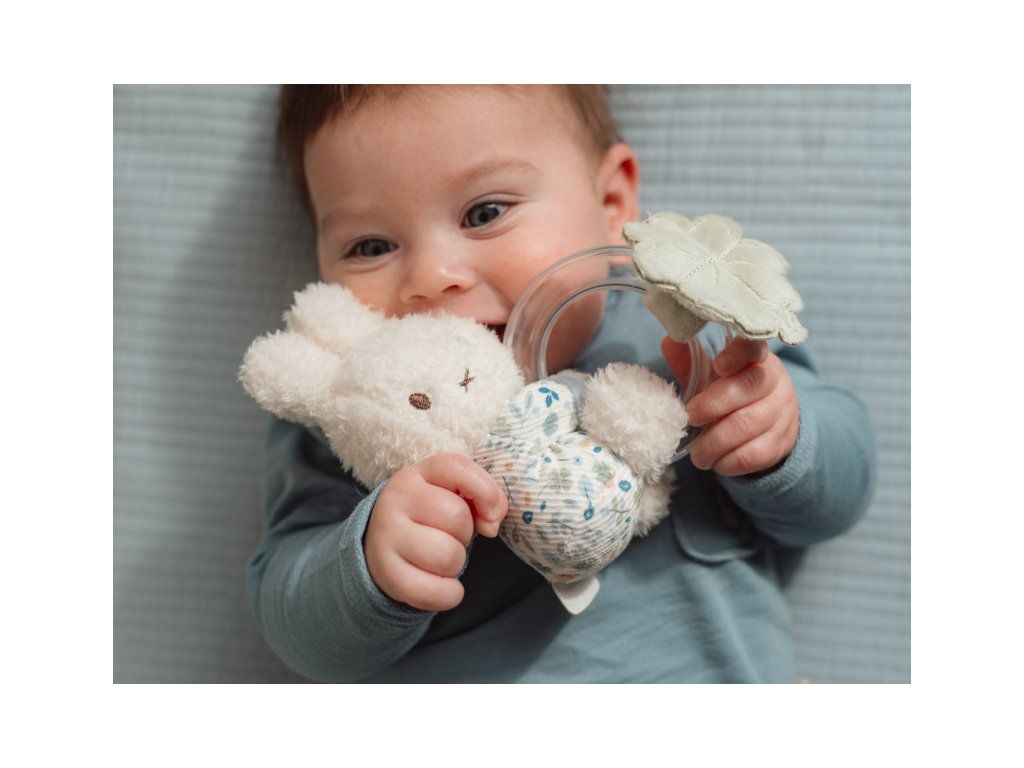 Rozkošný králiček z jemného plyšu drží hrkálku s korálkami, ktorá vydáva pri pohybe jemný zvuk. Hračka podporuje rozvoj zmyslov, zvedavosti a jemnej motoriky dieťaťa.