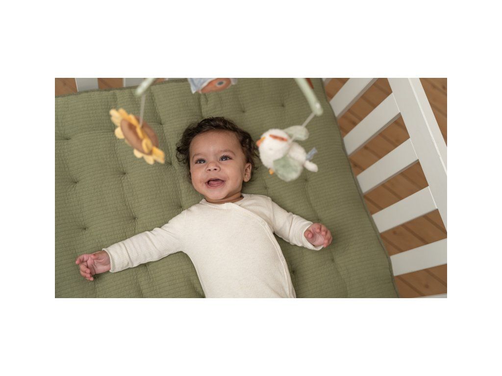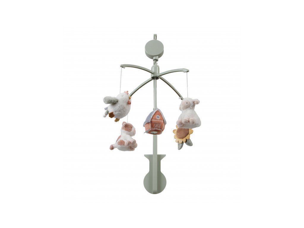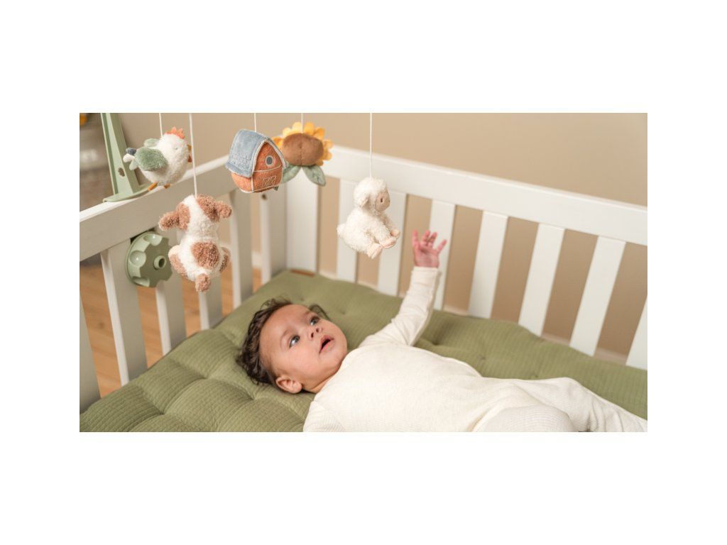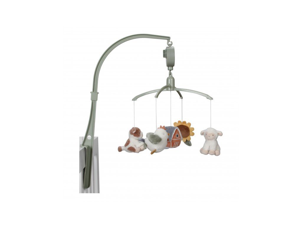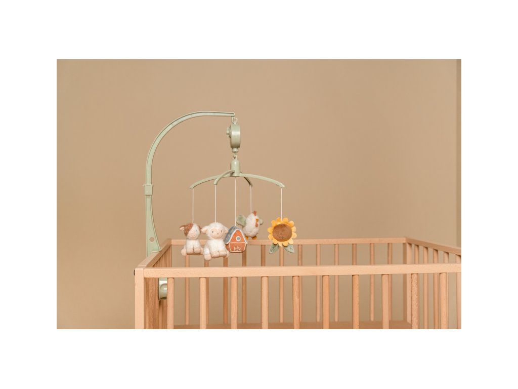 Kolotoč s naťahovacím hudobným boxom hrá nežnú uspávanku pre pokojné zaspávanie. Pozornosť dieťaťa upútajú otáčajúce sa plyšové hračky v podobe ovečky, sliepočky, kravičky, slnečnice a domčeka. Kolotoč ľahko pripevníte na bočnicu postieľky.