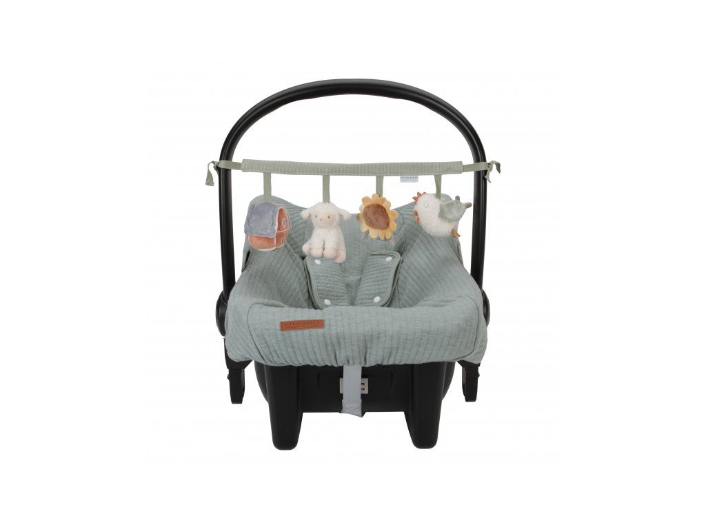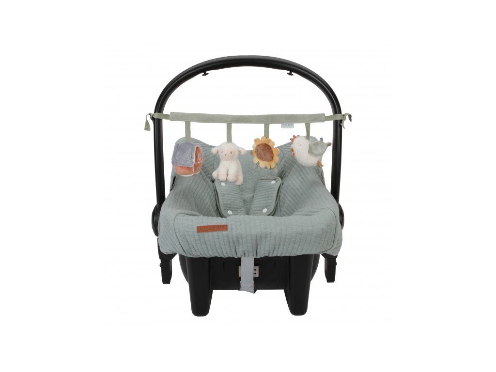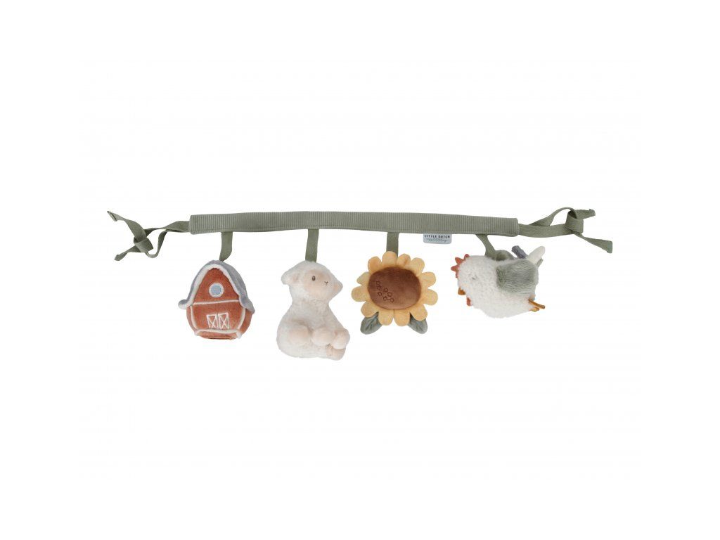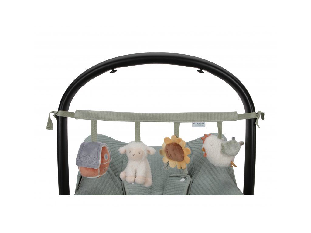 Štyri zavesené plyšové hračky v podobe sliepočky, ovčeky, slnečnice a domčeka zabavia vaše bábätko na cestách v autosedačke či kočíku. Jednotlivé hračky pri skúmaní detskými ručičkami hrkajú, po stlačení pískajú a šuštia. Hračky stimulujú koordináciu ruka/oko dieťaťa.