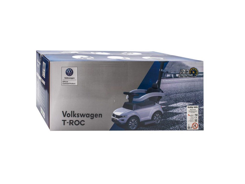 Detské odrážadlo s vodiacou tyčou VOLKSWAGEN T-ROC je vyrobené v licencii koncernu Volkswagen. Jeho športový vzhľad upúta pozornosť nielen každé dieťaťa, ale aj rodičov. Váš malý pretekár či pretekárka sa v ňom bude cítiť ako v naozajstnom aute. Odrážadlo je vyrobené s dôrazom na každý detail a kvalitu použitých materiálov. Odrážadlo pomáha rozvíjať motorické schopnosti dieťaťa a zaručí mu veľa zábavy a srandy. Autíčko má na volante efektnú húkačku a tlačidlá s melódiami. Je určené ako pre najmenšie deti, ktoré už vedia sedieť, tak aj pre deti, ktoré sa už naučili chodiť. Odrážadlo má široké a komfortné sedadlo s úložným priestorom, kvalitné plastové kolesá a pohodlnú a zároveň pevnú vodiacu tyč s držiakom na nápoje, ktorou možno odrážadlo riadiť. Vodiaca tyč, opierky na ruky a podnožky je možné zložiť, a tým dieťa využije autíčko ako klasické odrážadlo. Batérie nie sú súčasťou balenia (2x AA 1.5V).
