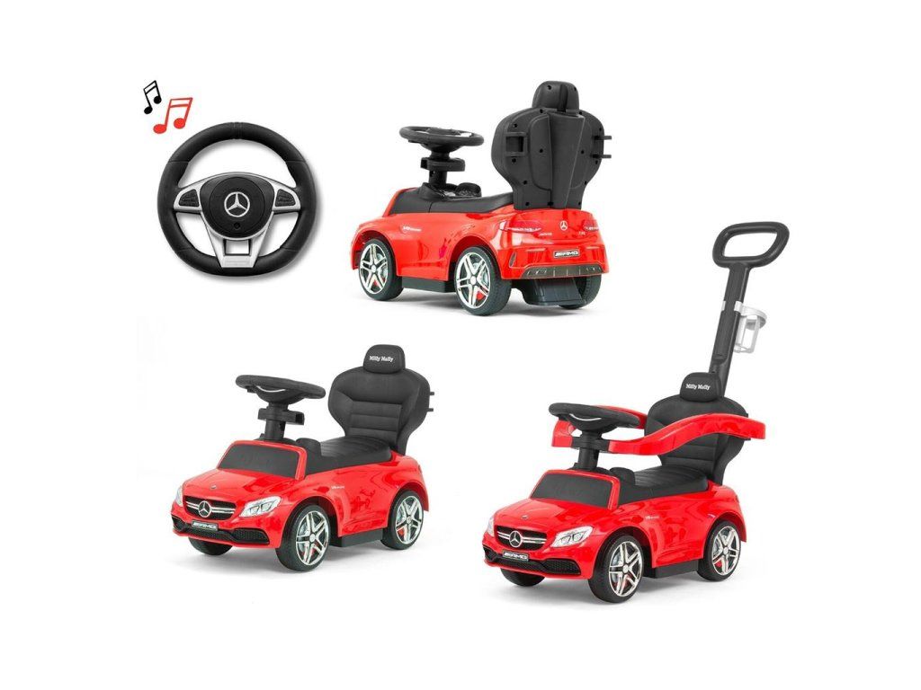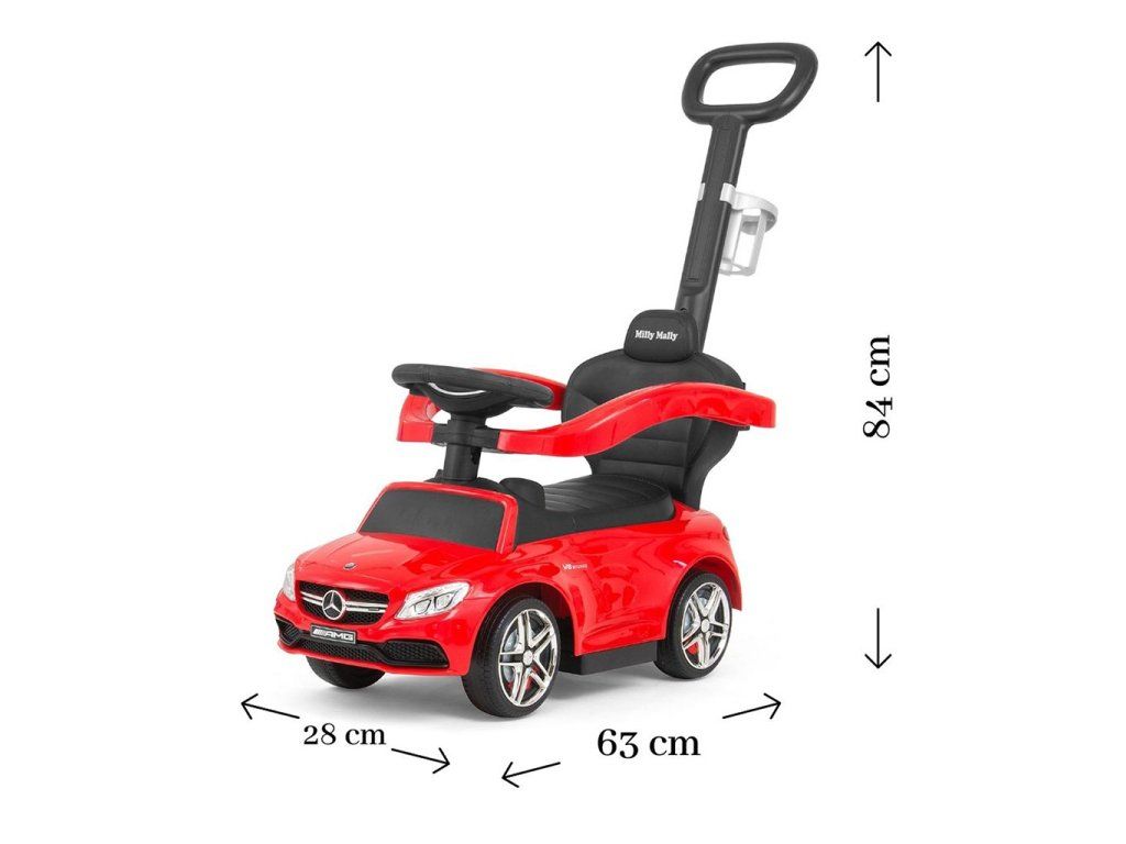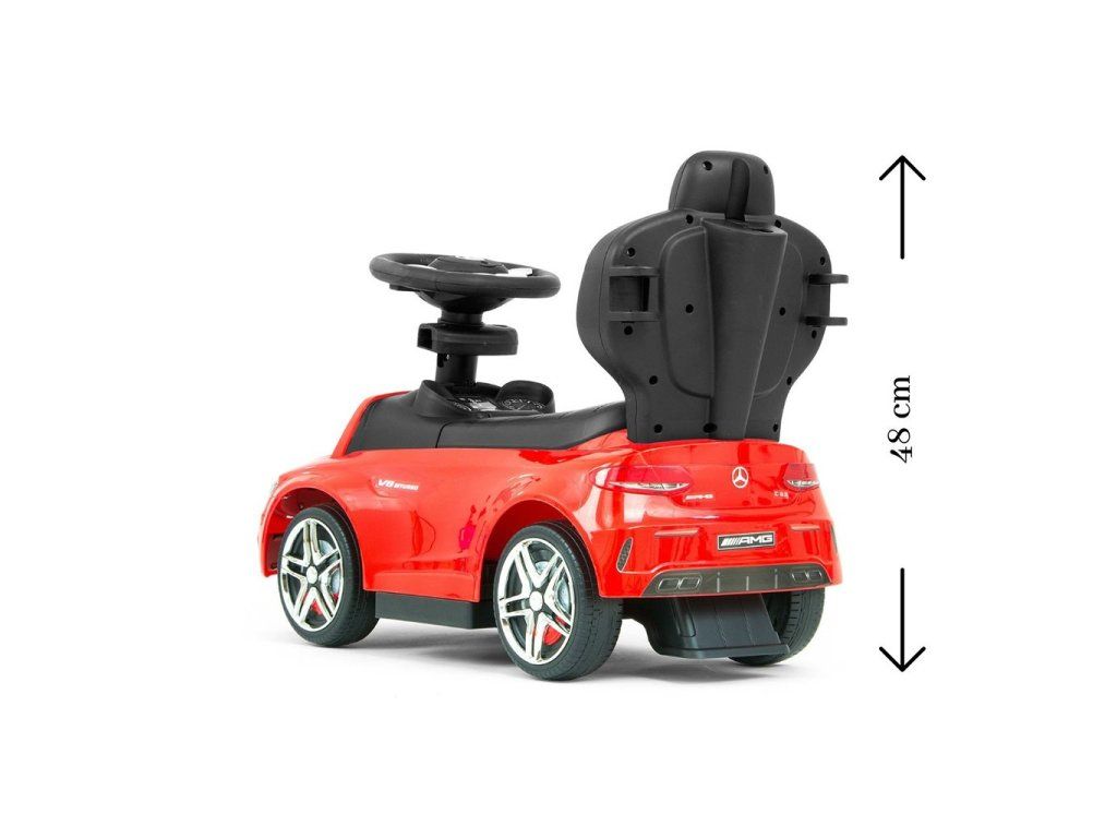Detské odrážadlo s vodiacou tyčou Mercedes Benz AMG C63 Coupe je vyrobené z kvalitného plastového materiálu.S autíčkom si deti užijú veľa zábavy pretože má nenapodobiteľný vzhľad skutočného Mercedesu, komfortné široké sedadlo s úložným priestorom, volant, kvalitné plastové kolesá a pohodlnú a zároveň pevnú vodiacu tyč s držiakom na nápoje, s ktorou je možné riadiť autíčko. Vodiaca tyč, opierky na ruky a podnožky je možné zložiť, a tým dieťa využije autíčko ako klasické odrážadlo. Batérie nie sú súčasťou balenia (2x AA 1.5V).