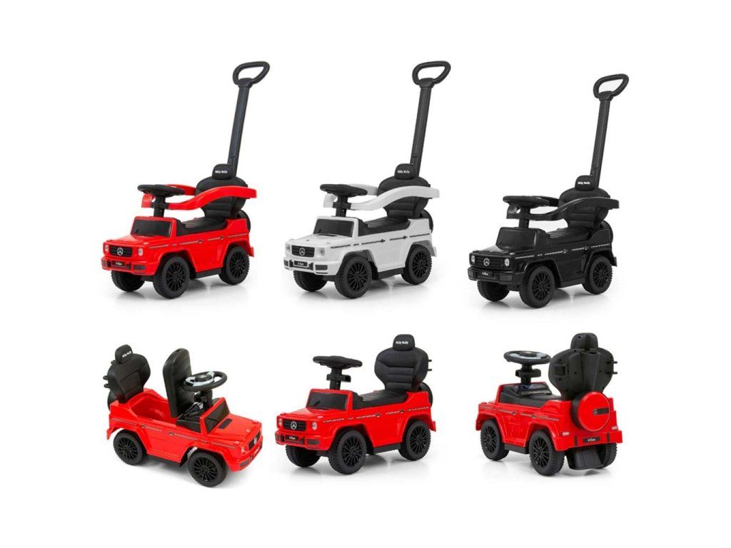 Detské odrážadlo s vodiacou tyčou MERCEDES G350d je vyrobené v licencii koncernu MERCEDES. Váš malý pretekár či pretekárka sa v ňom bude cítiť ako v naozajstnom džípe. Odrážadlo je vyrobené s dôrazom na každý detail a kvalitu použitých materiálov. Jeho vzhľad upúta pozornosť nielen každého dieťaťa, ale aj rodičov. Odrážadlo pomáha rozvíjať motorické schopnosti dieťaťa a Váš malý pretekár či pretekárka si s ním užije veľa zábavy a srandy. Autíčko má na trojramennom volante tlačidla vydávajúce rôzne melódie, zvuk motora alebo húkačku. Je určené ako pre najmenšie deti, ktoré už vedia sedieť, tak aj pre deti, ktoré sa už naučili chodiť. Odrážadlo má otočné predné kolesá, široké a komfortné sedadlo s úložným priestorom a pohodlnú a zároveň pevnú vodiacu tyč, ktorou možno odrážadlo riadiť. Vodiaca tyč, opierky na ruky a podnožky sa dajú zložiť a tým dieťa využije autíčko ako klasické odrážadlo. Batérie nie sú súčasťou balenia (2x AA 1.5V).