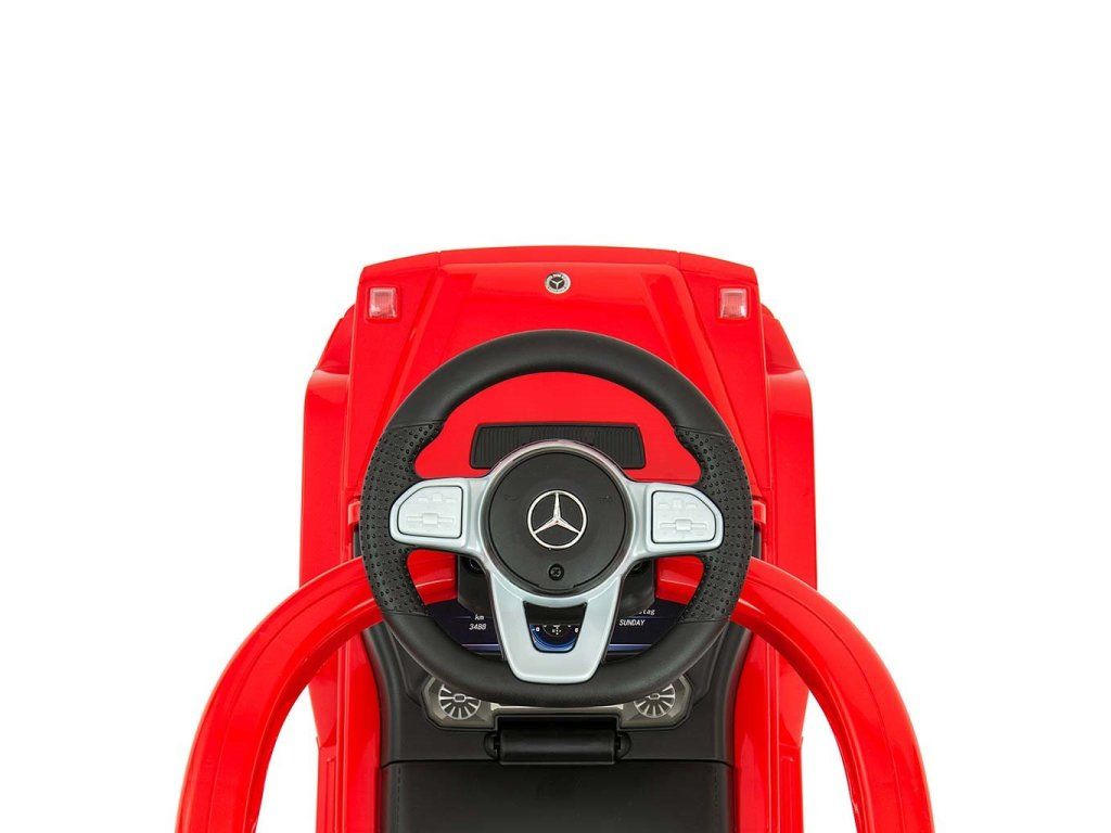 Detské odrážadlo s vodiacou tyčou MERCEDES G350d je vyrobené v licencii koncernu MERCEDES. Váš malý pretekár či pretekárka sa v ňom bude cítiť ako v naozajstnom džípe. Odrážadlo je vyrobené s dôrazom na každý detail a kvalitu použitých materiálov. Jeho vzhľad upúta pozornosť nielen každého dieťaťa, ale aj rodičov. Odrážadlo pomáha rozvíjať motorické schopnosti dieťaťa a Váš malý pretekár či pretekárka si s ním užije veľa zábavy a srandy. Autíčko má na trojramennom volante tlačidla vydávajúce rôzne melódie, zvuk motora alebo húkačku. Je určené ako pre najmenšie deti, ktoré už vedia sedieť, tak aj pre deti, ktoré sa už naučili chodiť. Odrážadlo má otočné predné kolesá, široké a komfortné sedadlo s úložným priestorom a pohodlnú a zároveň pevnú vodiacu tyč, ktorou možno odrážadlo riadiť. Vodiaca tyč, opierky na ruky a podnožky sa dajú zložiť a tým dieťa využije autíčko ako klasické odrážadlo. Batérie nie sú súčasťou balenia (2x AA 1.5V).