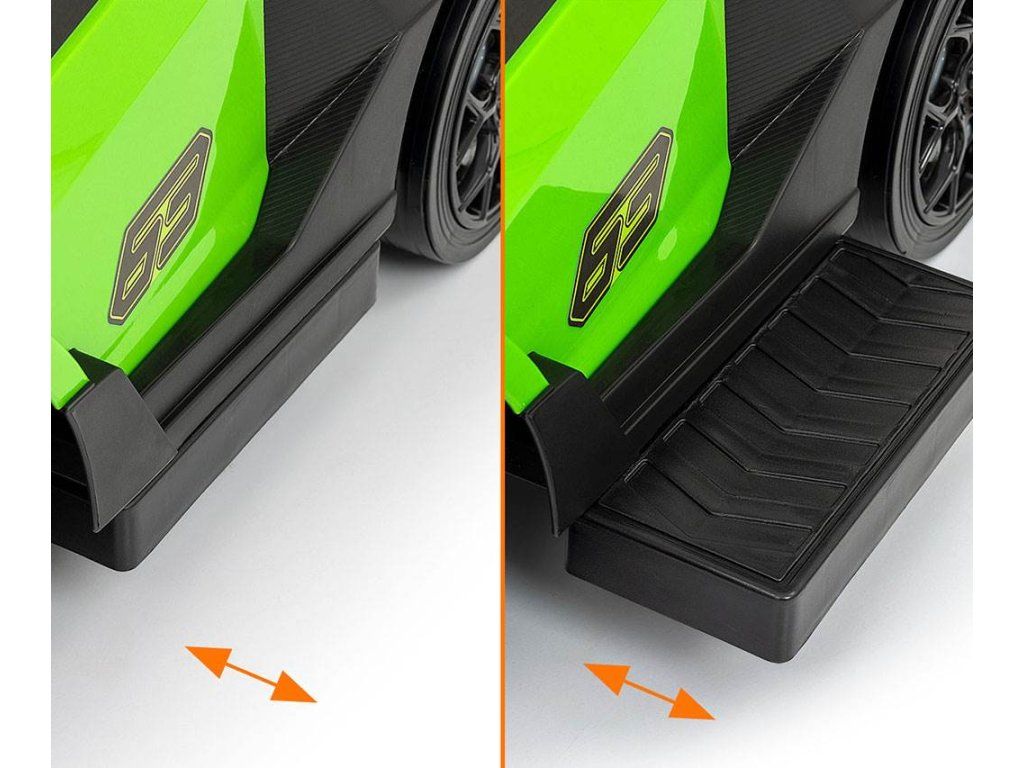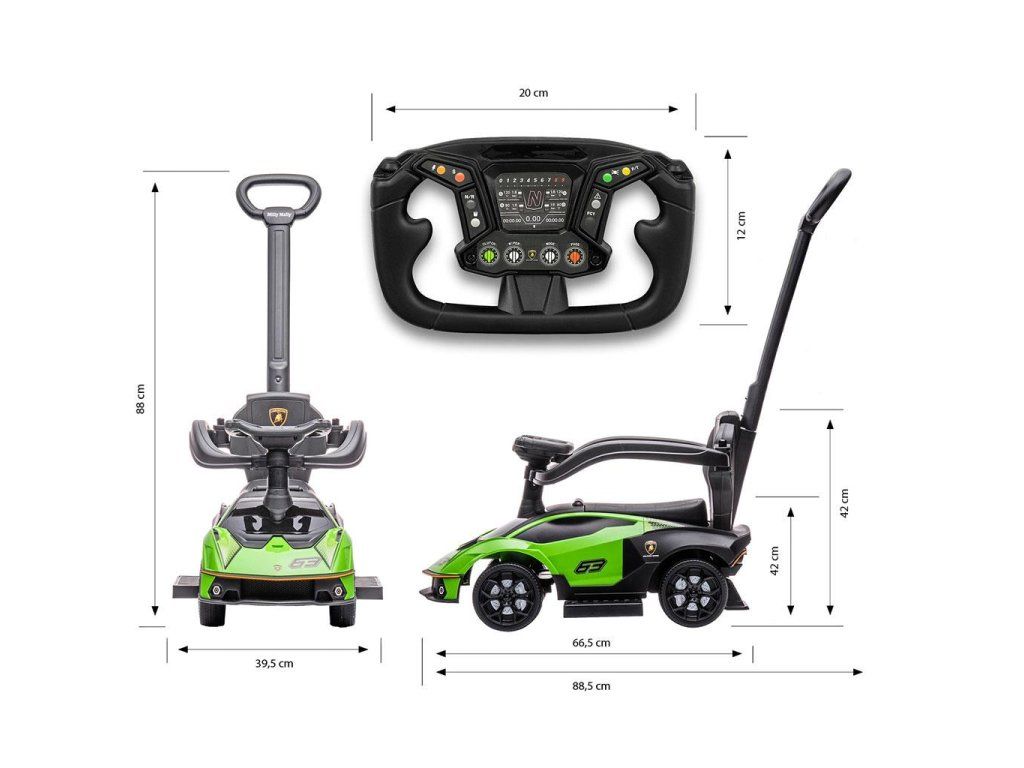 Odrážadlo licencované Lamborghini a Lamborghini Bull and Shield - talianska značka luxusných vozidiel a superáut. Vozidlo je vyrobené s veľkým dôrazom na najmenšie detaily a kvalitu použitých materiálov. Vozidlo je vernou kópiou modelu Essenza SC V12 - ktorý bol nazývaný hypercar. Jazdné vozidlo je rovnako ako jeho prototyp kombináciou športového dizajnu, dravého charakteru a možností, ktoré má. Vozidlo je vyrobené z najkvalitnejších materiálov, ktoré sa vyznačujú vysokou odolnosťou a bezpečnosťou (používajú sa pri výrobe doplnkov a hračiek pre deti). Multifunkčnosť vozidla umožňuje mnohoročné používanie. Vďaka ďalším možnostiam sa hračka rýchlo neomrzí a hraním sa dieťa rozvinie svoje manuálne zručnosti a motoriku. Súčasťou výbavy je interaktívny volant – vďaka ktorému bude zábava ešte zaujímavejšia! Výrobok má otočné kolesá, ktoré môže rodič ľahko ovládať pomocou rukoväte. To sa premieta do pohodlia pri prechádzkach. Zábrany a madlo sa veľmi ľahko montujú a demontujú. Oceľové osi kolies zaisťujú stabilitu a odolnosť pojazdu. Na druhú stranu pneumatiky vyrobené z PVC - termoplastického materiálu, ktorý sa vyznačuje veľkou pružnosťou a odolnosťou, umožňujú jeho použitie na všetkých povrchoch bez toho, aby došlo k poškodeniu alebo poškriabaniu. Profilované sedadlo a systém zábran poskytuje vysoký komfort a bezpečnosť pre najmenších užívateľov - odrážadlo môže používať aj dieťa staršie ako 12 mesiacov. Dodatočná ochrana - umiestnená pod vozidlom (v zadnej časti) chráni staršie deti pred prevrátením pri rýchlejšej jazde. Možnosť odopnutia jednotlivých prvkov umožňuje upraviť vozidlo podľa aktuálnych potrieb, zručností a fáz vývoja dieťaťa, čím povoz "rastie" s dieťaťom.