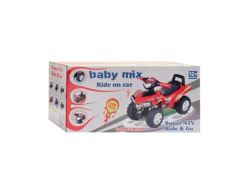 Skvelá detská štvorkolka Baby Mix s tromi melódiami, klaksónom a blikajúcimi svetlami na riadidlách. Štvorkolka má veselé farby a je vyrobená z kvalitného a pevného plastového materiálu. Kolobežka pomáha rozvíjať motorické zručnosti dieťaťa a zaručuje veľa zábavy. Je určená pre najmenšie deti, ktoré už vedia sedieť, ako aj pre deti, ktoré sa už naučili chodiť. Vaše dieťa si so štvorkolkou užije veľa zábavy. Naša super štvorkolka vyzerá skvele, má pohodlné široké sedadlo, široké riadidlá a veľké plastové kolesá. Na riadidlách má efektný klaksón a tlačidlo s tromi uloženými melódiami. Batérie nie sú súčasťou balenia (2x AA 1,5 V). Farby nálepiek sa môžu líšiť podľa aktuálnej ponuky.