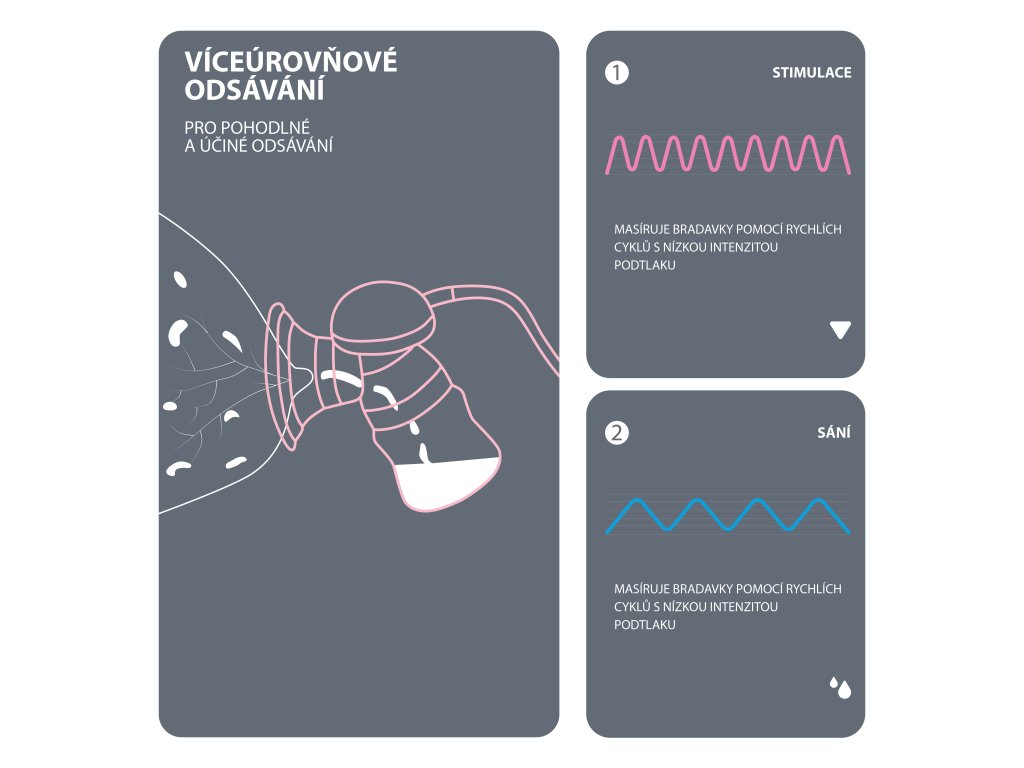 Odsávačka mlieka Yooki má 2 fázy - stimuláciu a odsávanie. Stimulácia masíruje bradavku pomocou rýchlych, nízkych vákuových cyklov, aby sa prsník pripravil na odsávanie. Druhá fáza potom vďaka pomalším cyklom s vyššou úrovňou podtlaku presne napodobňuje prirodzené sanie dieťaťa.