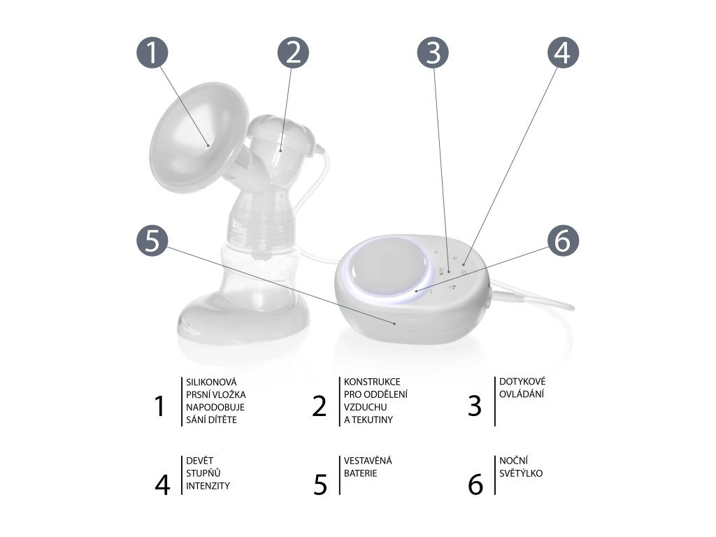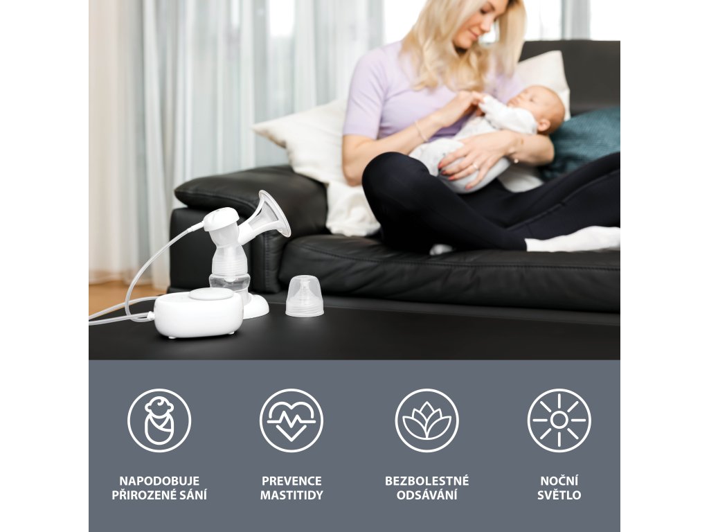Extrémne tichá prevádzka vám poskytuje súkromie mimo domu, ale umožňuje vysávať aj v noci vedľa spiaceho dieťaťa. Veľkou výhodou je zabudované stmievateľné nočné svetlo, vďaka ktorému je odsávanie dobre viditeľné, ale nie také silné, aby dieťa zobudilo.