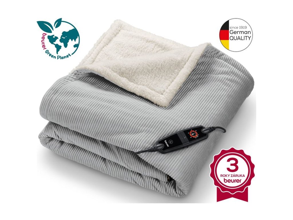 Vyhrievacia deka BEURER HD81 Grey zo série Green Planet s povrchom z mäkkej manšestrovej látky zaistí príjemné chvíle na pohovke alebo v spálni. Pre väčšiu udržateľnosť je horná a spodná časť tepelnej prikrývky vyrobená zo 100% a odnímateľný spínač z 50% recyklovaného materiálu. Pre bezpečný a čistý pocit má HD81 Green Planet automatické vypnutie a možno ju prať v práčke. Priedušná vyhrievaná deka v trendovej šedej farbe stvorená pre tie najútulnejšie dni!Charakteristika a technické údaje: Vrchná/spodná časť vyrobená zo 100% recyklovaného materiálu Kryt spínača vyrobený z približne 50 % recyklovaného materiálu Balenie vyrobené zo 100% recyklovaného materiálu Trendová, mäkká manšestrová látka 6 podsvietených nastavení teploty Nastavenia eko teploty (nastavenie 1 a 2) Elektronická regulácia teploty Automatické vypnutie po cca 3 hodinách BSS (Beurer Safety System) Rozmery produktu: 180 x 130 cm Odnímateľná riadiaca jednotka Možno prať v práčke do 30 °C (extra jemný program) OEKO-TEX 100 (textílie použité v tomto zariadení spĺňajú prísne ekologické ) Napájanie: 220-240 V, 50-60 Hz Výkon: 100-110 W Hmotnosť produktu: cca 2000 g CE: áno Záruka: 3 rokyElektrická deka HD81 od nemeckej spoločnosti Beurer má certifikát Oeko-Tex 100, čo znamená, že textílie použité pre toto zariadenie spĺňajú prísne ekologické požiadavky Oeko-Tex Standard 100 (overené Hohenstein Research inštitútom).HD81 je nenahraditeľným spoločníkom pri večernom odpočinku, pri čítaní kvalitnej literatúry alebo sledovaní filmu. Zvoľte jednu z 6 nastaviteľných teplôt a nechajte sa objať do teplého a mäkučkého náručia, vďaka ktorému na vás bude zima zaručene krátka. Upokojujúce teplo presne tam, kde ho potrebujete!Ochrana životného prostredia a zachovanie zdrojov patria medzi najväčšie výzvy našej doby. S novou sériou Beurer „Green Planet“, ktorá pozostáva z výhrevných podušiek, vyhrievaných diek a vyhrievaných podložiek, si teraz môžete vychutnávať chvíle pohody ešte udržateľnejšie. Tieto produkty sú výsledkom približne dvoch rokov práce Beureru na vývoji rozsiahlej stratégie trvalej udržateľnosti – od nápadu, cez použitie recyklovaných materiálov až po kompaktné recyklované obaly. Vychutnajte si útulnosť a teplo trvalo.Dodatočné parametre