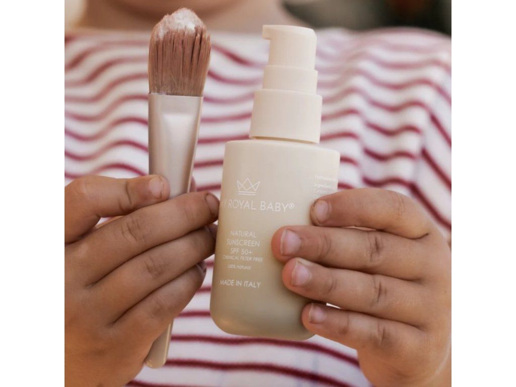 Naneste opaľovací krém na tvár dieťaťa a venujte zvláštnu pozornosť citlivým oblastiam, ako sú tváre a nos. Na rovnomerné nanesenie krému použite mäkký štetec pre deti. Znovu naneste po kúpaní, osušení uterákom alebo dlhšom vystavení slnku.