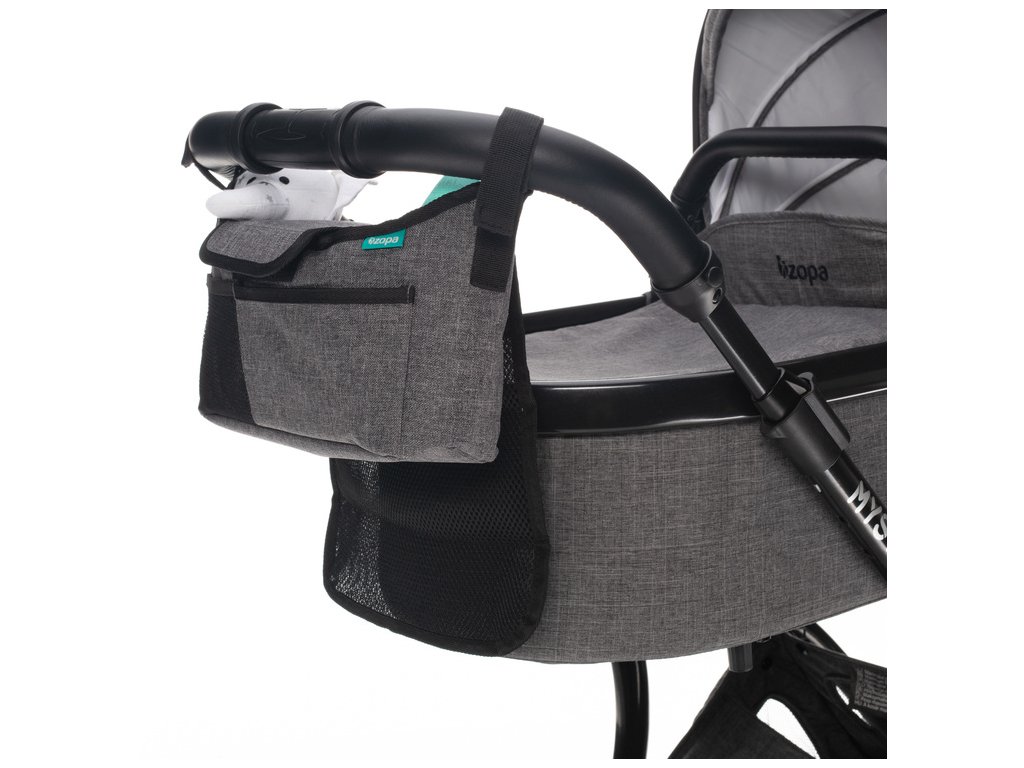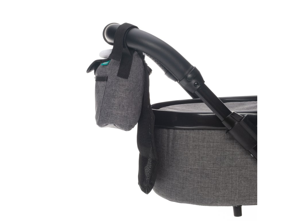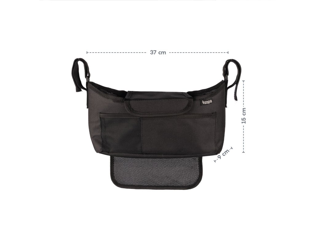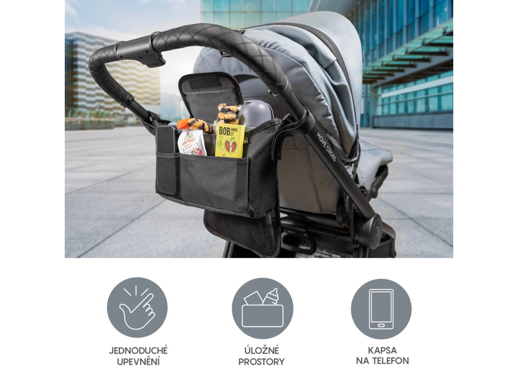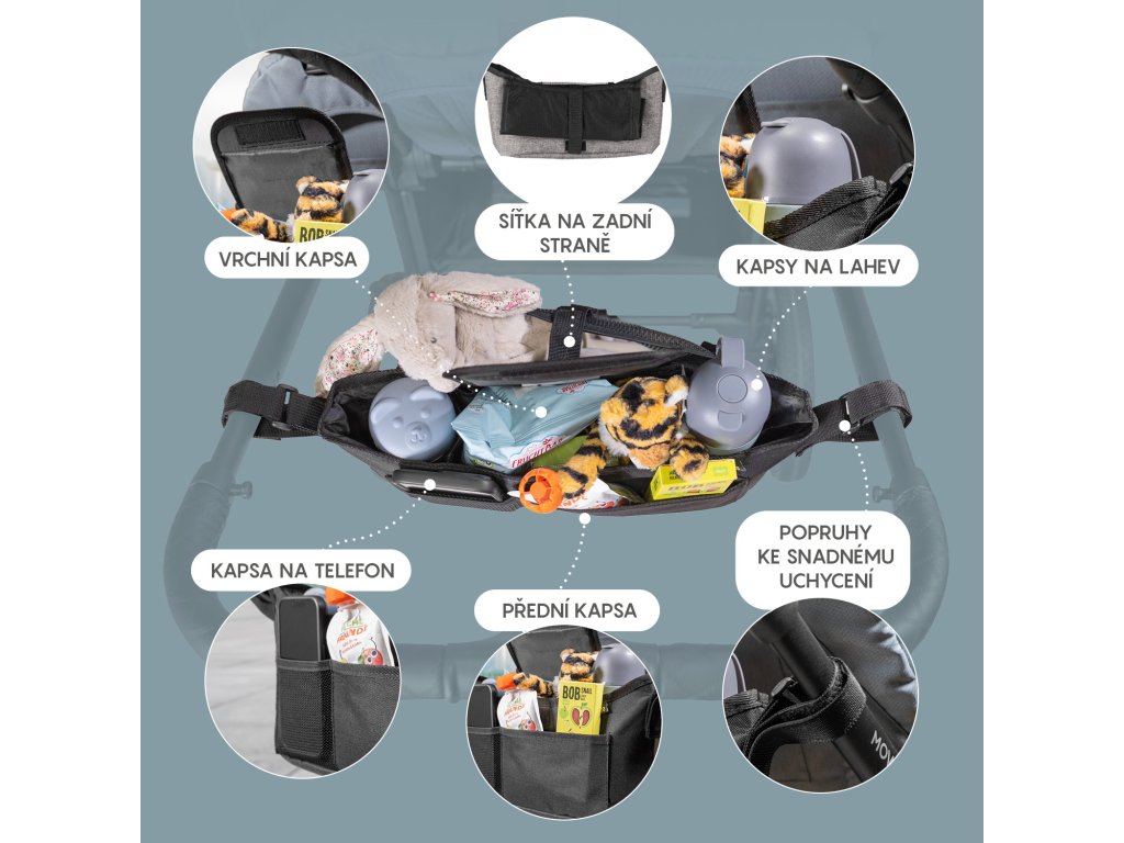 Organizér na kočík PLUS je svojou perfektnou veľkosťou vhodný ku každému kočíku. Je veľmi priestranný a obsahuje až 6 vreciek, ktoré vyhovejú potrebám a požiadavkám každej modernej mamičky. Samozrejmosťou je predné vrecko na mobil a vrecko na drobnosti. V zadnej časti organizéra sa nachádza väčšie sieťovinové vrecko na umiestnenie časopisov. Hlavné vrecko je riešená tak, aby sa po bokoch dali umiestniť fľaše. Jeho inštalácia je jednoduchá a rýchla za pomoci háčikov na suché zipsy.