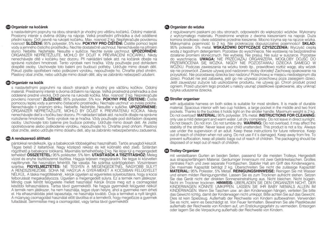 UPOZORNENIE! Organizér nepreťažujte, mohlo by dôjsť k prevráteniu kočíku! Nikdy nenechávajte dieťa bez dozoru. Pri naskladaní tašiek na kočík dbajte na správne rozloženie hmotnosti. Tento výrobok nie je hračka. Vždy používajte pod dohľadom dospelej osoby. Uschovajte toto balenia pre budúce potreby. Udržujte mimo dosah detí. Ak zistíte opotrebovanie alebo poškodenie výrobku, nepoužívajte ho. Chráňte pred ohňom. Plastový obal zničte, alebo udržujte mimo dosahu detí, aby sa zabránilo nebezpečenstvu zadusenia.