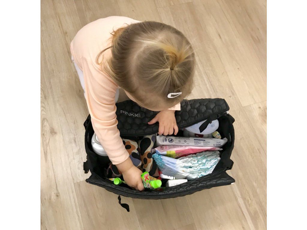 Vnútri: sieťované kapsičky, pútka z gumy na fľaštičky.