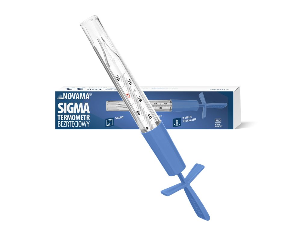 NOVAMA SIGMA je bezortuťový teplomer, ktorý ponúka maximálnu jednoduchosť a ekologické riešenie. Na jeho použitie nepotrebujete žiadne batérie ani napájanie, čo z neho robí spoľahlivého a udržateľného pomocníka. Meranie je veľmi jednoduché – stačí teplomerom zatriasť, zmerať teplotu a po použití ho dezinfikovať.