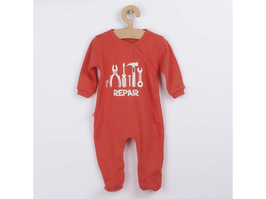 Dojčenský overal Koala Repair. Overal je zdobený nápisom Repair a obrázkom kutilského náradia. Praktické bočné zapínanie na cvočky po celej dĺžke a medzi nožičkami veľmi uľahčí obliekanie a prebaľovanie. Materiál: 100% bavlna.Dodatočné parametre
