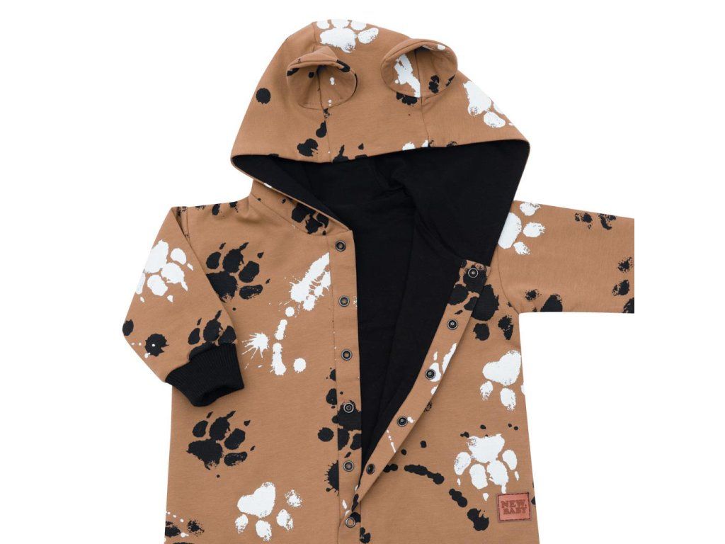 Nápaditý bavlnený dojčenský overal New Baby Paw. Overal je celopotlačený detským vzorom. Je vyrobený z kvalitného bavlneného materiálu s elastanom a bavlnenou podšívkou. Materiál je hladký a príjemný na dotyk. Praktické zapínanie na cvočky po celej dĺžke veľmi uľahčí obliekanie a prebaľovanie. Overal má praktickú kapucňu s uškami, širšie pružné lemy na rukách a nohavičkách a celá vnútorná strana je zateplená bavlnenou podšívkou, ktorá zvyšuje komfort nosenia. Bábätko sa bude cítiť v overale veľmi pohodlne a príjemne. Zloženie: 95% bavlna, 5% elastan, podšívka-95% bavlna, 5% elastan. Vhodné na jar a na jeseň.