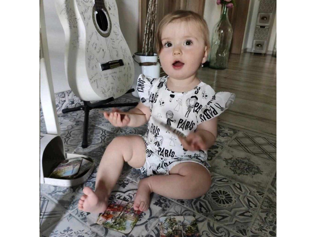 Letný bavlnený overal s krátkym volánikovým rukávom New Baby Paris. Overal zdobí potlač s motívom Paris a roztomilé volánikové rukávky. Má praktické zapínanie na cvočky na ramienku a medzi nožičkami, čo uľahčí obliekanie a prebaľovanie. Pekný letný motív rozžiari všetky dievčatká. Zloženie: 100% bavlna.Dodatočné parametre