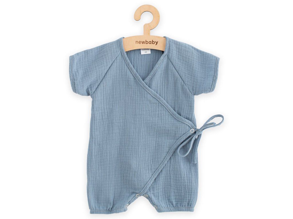 Štýlový letný mušelínový overal s krátkym rukávom New Baby. Zavinovací overálik s krátkym rukávom má praktické zaväzovanie na boku na šnúrky, z vnútornej strany na cvoček a medzi nožičkami na cvočky čo uľahčí obliekanie a prebaľovanie. Na nohavičkách sú jemné gumičky, ktoré ale netlačia na nožičkách. Super štýlový letný overal rozžiari každé bábätko.