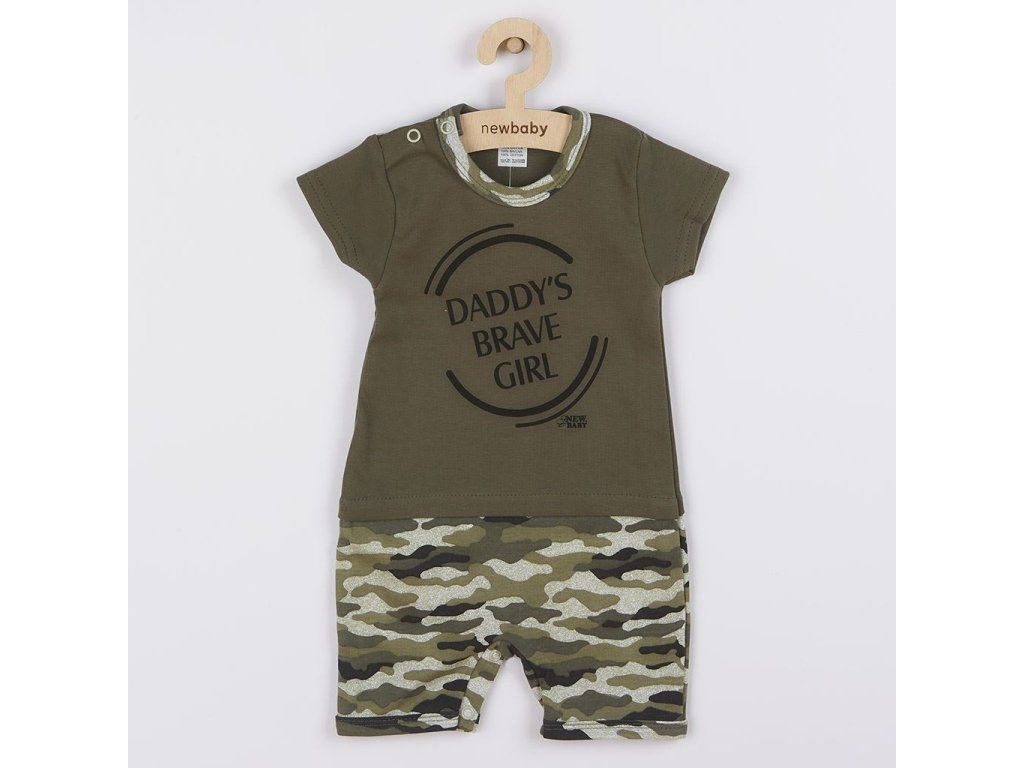 Letný bavlnený overal s krátkym rukávom New Baby Army. Dievčenský overal zdobí maskáčová potlač a nápis DADDY'S BRAVE GIRL. Má praktické zapínanie na cvočky na ramienku a medzi nožičkami. Zloženie: 100% bavlna.