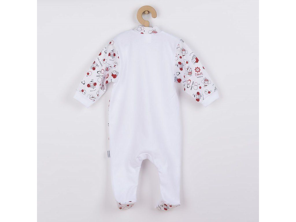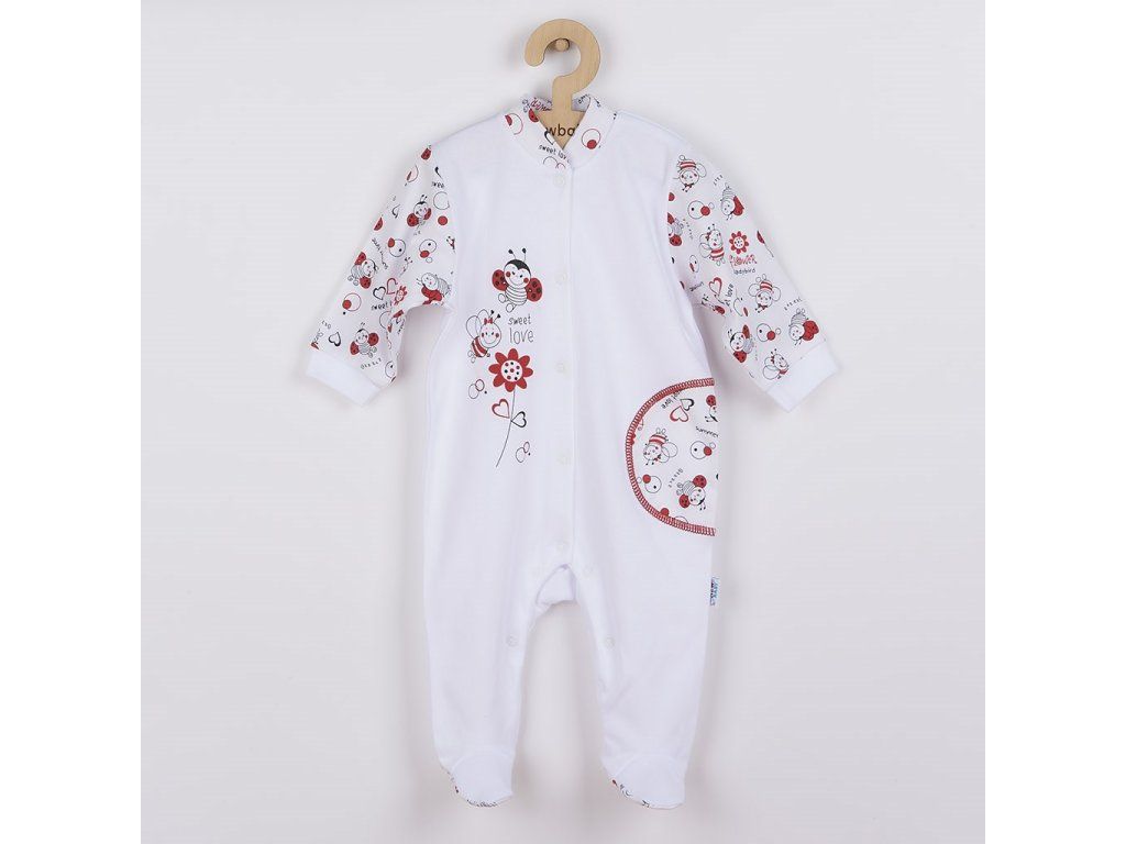 Dojčenský overal New Baby Lienka. Overal je bielo-červený s obrázkom lienok. Rozmery: obvod okolo hrudníka cca 60 cm, dĺžka od ramienok cca 58 cm, dĺžka rukáva cca 27 cm, dĺžka od rozkroku cca 20 cm. Zloženie: 100% bavlna.Dodatočné parametre