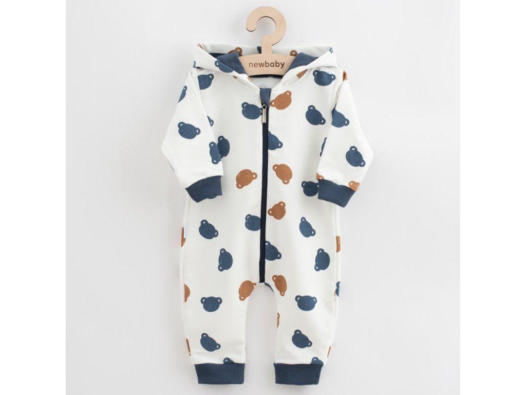 Roztomilý a praktický overal s kapucňou New Baby Little One. Overal je celopotlačený medvedíkmi, má zapínanie na zips po celej dĺžke a pružné lemy na rukávoch a nohavičkách. Kapucňa je podšitá farebnou podšívkou a je zdobená roztomilým brmbolcom. Overal je vyrobený z pohodlnej teplákoviny. Vhodný na celoročné nosenie. Materiál: 96% bavlna, 4% elastan.