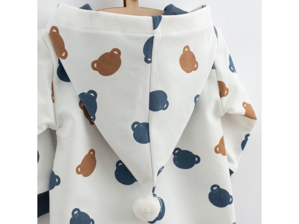 Roztomilý a praktický overal s kapucňou New Baby Little One. Overal je celopotlačený medvedíkmi, má zapínanie na zips po celej dĺžke a pružné lemy na rukávoch a nohavičkách. Kapucňa je podšitá farebnou podšívkou a je zdobená roztomilým brmbolcom. Overal je vyrobený z pohodlnej teplákoviny. Vhodný na celoročné nosenie. Materiál: 96% bavlna, 4% elastan.