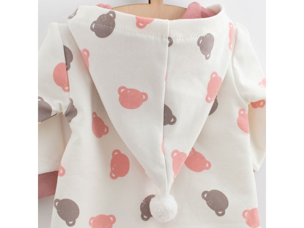 Roztomilý a praktický overal s kapucňou New Baby Little One. Overal je celopotlačený medvedíkmi, má zapínanie na zips po celej dĺžke a pružné lemy na rukávoch a nohavičkách. Kapucňa je podšitá farebnou podšívkou a je zdobená roztomilým brmbolcom. Overal je vyrobený z pohodlnej teplákoviny. Vhodný na celoročné nosenie. Materiál: 96% bavlna, 4% elastan.