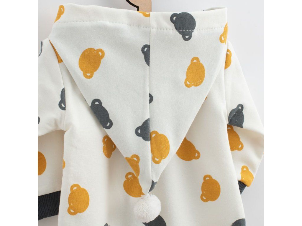 Roztomilý a praktický overal s kapucňou New Baby Little One. Overal je celopotlačený medvedíkmi, má zapínanie na zips po celej dĺžke a pružné lemy na rukávoch a nohavičkách. Kapucňa je podšitá farebnou podšívkou a je zdobená roztomilým brmbolcom. Overal je vyrobený z pohodlnej teplákoviny. Vhodný na celoročné nosenie. Materiál: 96% bavlna, 4% elastan.