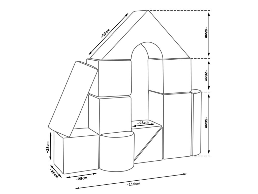 Všetky prvky sú bezpečné, ľahučké a mäkké, možno ich použiť na vytvorenie rôznych vlastných konštrukcií na cvičenie, hranie alebo na sedenie. Kocky umožňujú deťom ozvíjať fantáziu, koordináciu a motorické zručnosti.