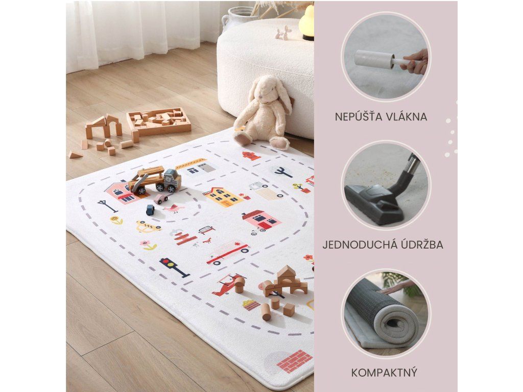 Detský koberec City 1.6 x 1.2 m Bezpečné a pohodlné miesto na hranie Detský koberec City je skvelým miestom pre deti na hranie, lezenie aj oddych. Má tri vrstvy – mäkký koralový zamat, pohodlnú elastickú pamäťovú penu a protišmykovú podložku, ktoré zaručia bezpečné a pohodlné hranie na zemi. Pamäťová pena je hrubá 2 cm a rýchlo sa vracia do pôvodného tvaru, čo je výhodou oproti lacnejším kobercom. S rozmermi 160 x 120 x 1.5 cm je dostatočne veľký nielen na detské hry, ale aj na jogu alebo relax.Štýlový a praktický doplnok do domácnosti Detský koberec s motívom mesta krásne doplní váš interiér. Jeho praktický dizajn umožňuje jednoduchú starostlivosť a ľahkú údržbu – stačí ho povysávať alebo utrieť vlhkou handričkou. Navyše, je vyrobený bez škodlivých látok ako sú BPA či ftaláty, takže si môžete byť istí, že vaše dieťa bude v bezpečí.Dodatočné parametre