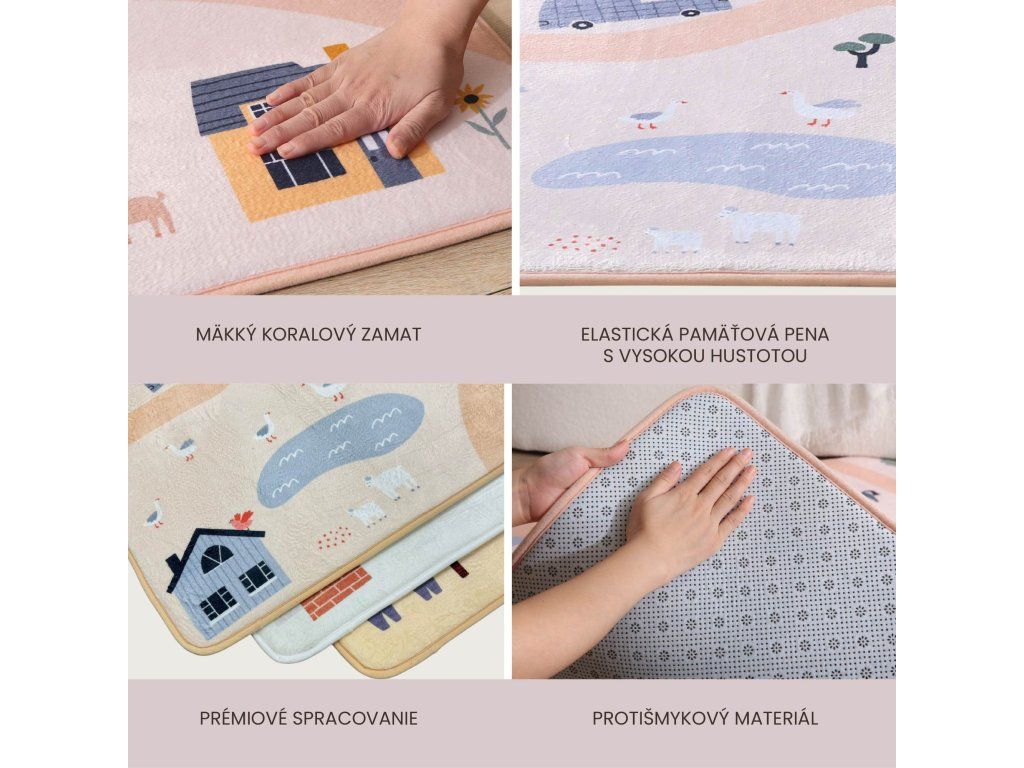 Detský koberec Farm 1.6 x 1.2 m Bezpečné a pohodlné miesto na hranie Detský koberec Farm je skvelým miestom pre deti na hranie, lezenie aj oddych. Má tri vrstvy – mäkký koralový zamat, pohodlnú elastickú pamäťovú penu a protišmykovú podložku, ktoré zaručia bezpečné a pohodlné hranie na zemi. Pamäťová pena je hrubá 2 cm a rýchlo sa vracia do pôvodného tvaru, čo je výhodou oproti lacnejším kobercom. S rozmermi 160 x 120 x 1.5 cm je dostatočne veľký nielen na detské hry, ale aj na jogu alebo relax.Štýlový a praktický doplnok do domácnosti Detský koberec s motívom farmy krásne doplní váš interiér. Jeho praktický dizajn umožňuje jednoduchú starostlivosť a ľahkú údržbu – stačí ho povysávať alebo utrieť vlhkou handričkou. Navyše, je vyrobený bez škodlivých látok ako sú BPA či ftaláty, takže si môžete byť istí, že vaše dieťa bude v bezpečí.Dodatočné parametre