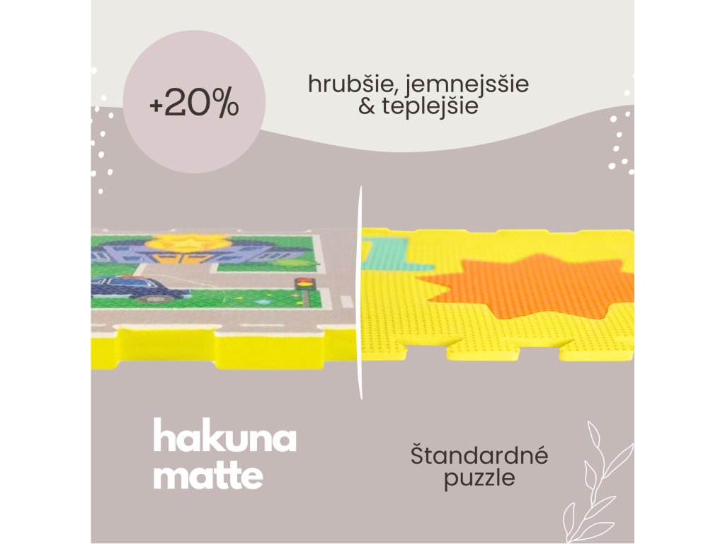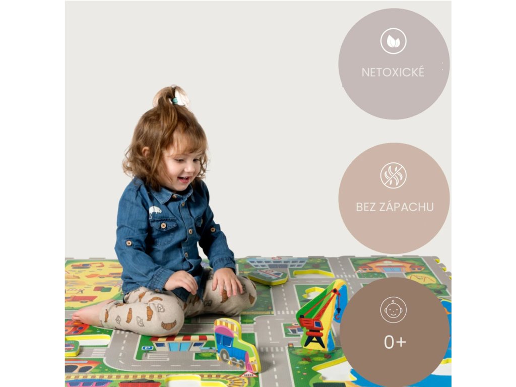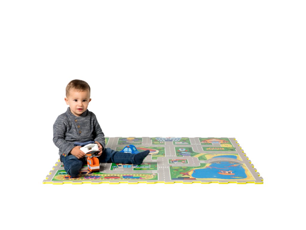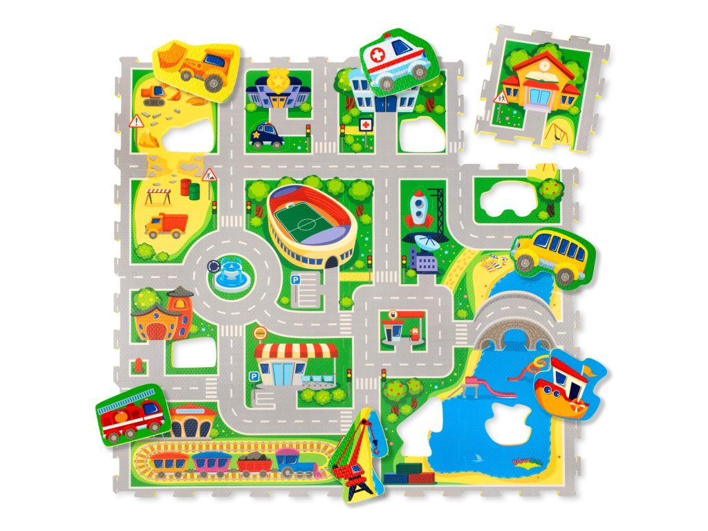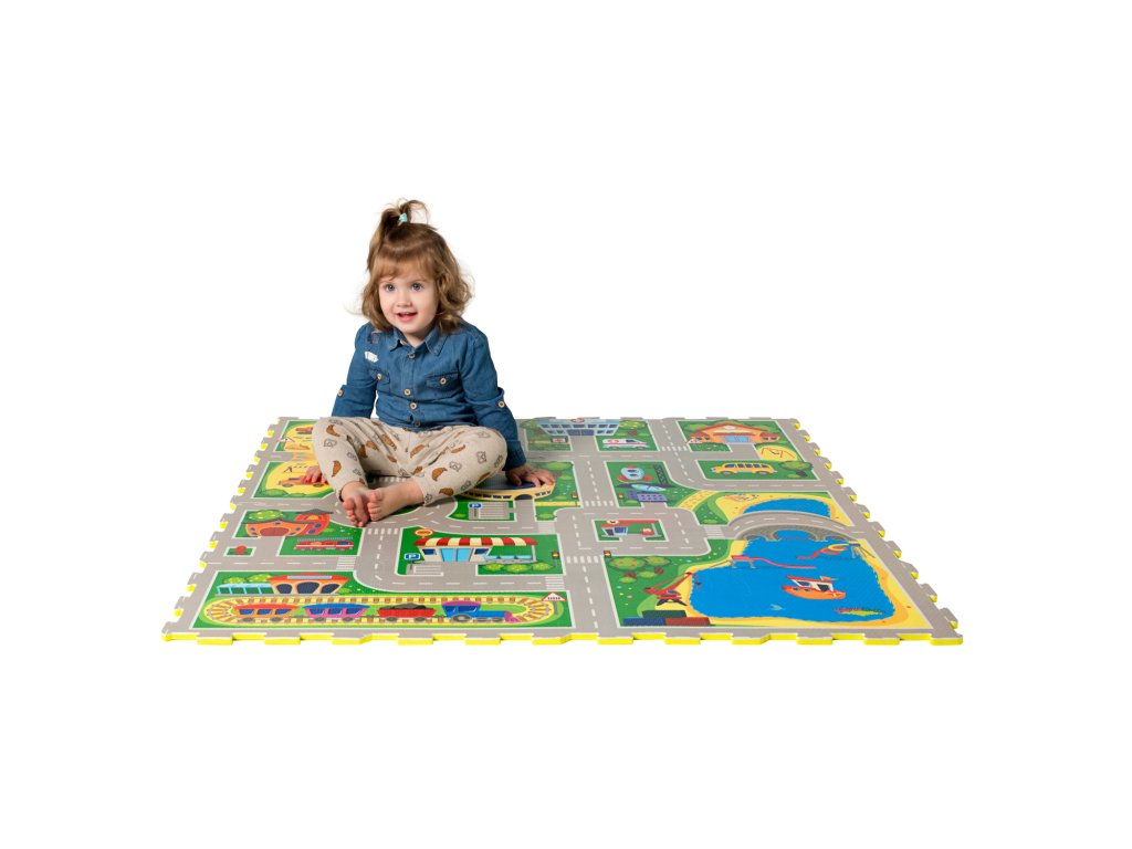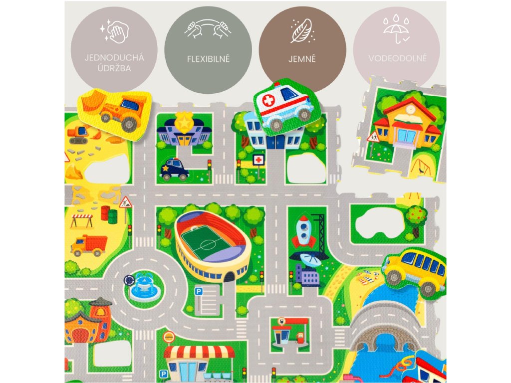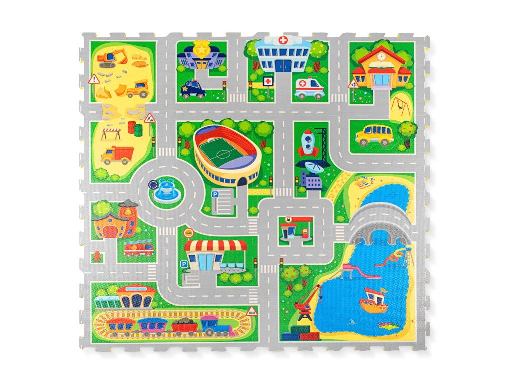 Hracia podložka Puzzle Mesto 1.2 x 1.2 m Vytvorte si fantastické puzzle mesto Zažite dobrodružstvo v úžasnom Puzzle Meste. Tento hravý koberec pozostáva zo 16 puzzle dielov, ktoré vytvárajú pestré cesty a budovy ako štadión, nemocnica, stavenisko a prístav. Deti sa môžu zabávať s 11 odnímateľnými tvarmi vozidiel, ktoré slúžia ako skvelé hračky na hranie. Vytvorte si vlastné mesto plné dobrodružstva a objavovania, kde si deti môžu rozvíjať svoju kreativitu a motorické zručnosti.Bezpečná zábava pre najmenších Hracia podložka Puzzle Mesto je vyrobená z kvalitnej EVA peny, ktorá je hrubá 1,2 cm a o 20% mäkšia a teplejšia ako iné alternatívy, čo zabezpečuje pohodlné a bezpečné hranie. Podložka je vodeodolná a jednoducho ju vyčistíte mydlom a handričkou, takže ju môžete používať nielen doma, ale aj vonku. Navyše, je 100% bez zápachu a neobsahuje nebezpečné látky ako formamid, BPA a ftaláty. Puzzle Mesto môžete rozšíriť o ďalšie puzzle koberce a vytvoriť tak ešte väčšie miesto na hranie.Dodatočné parametre