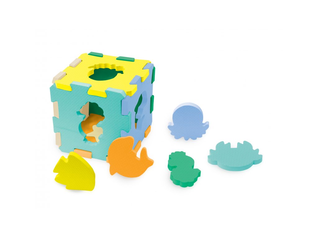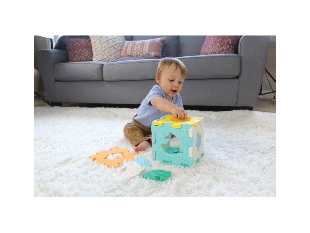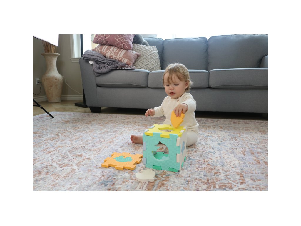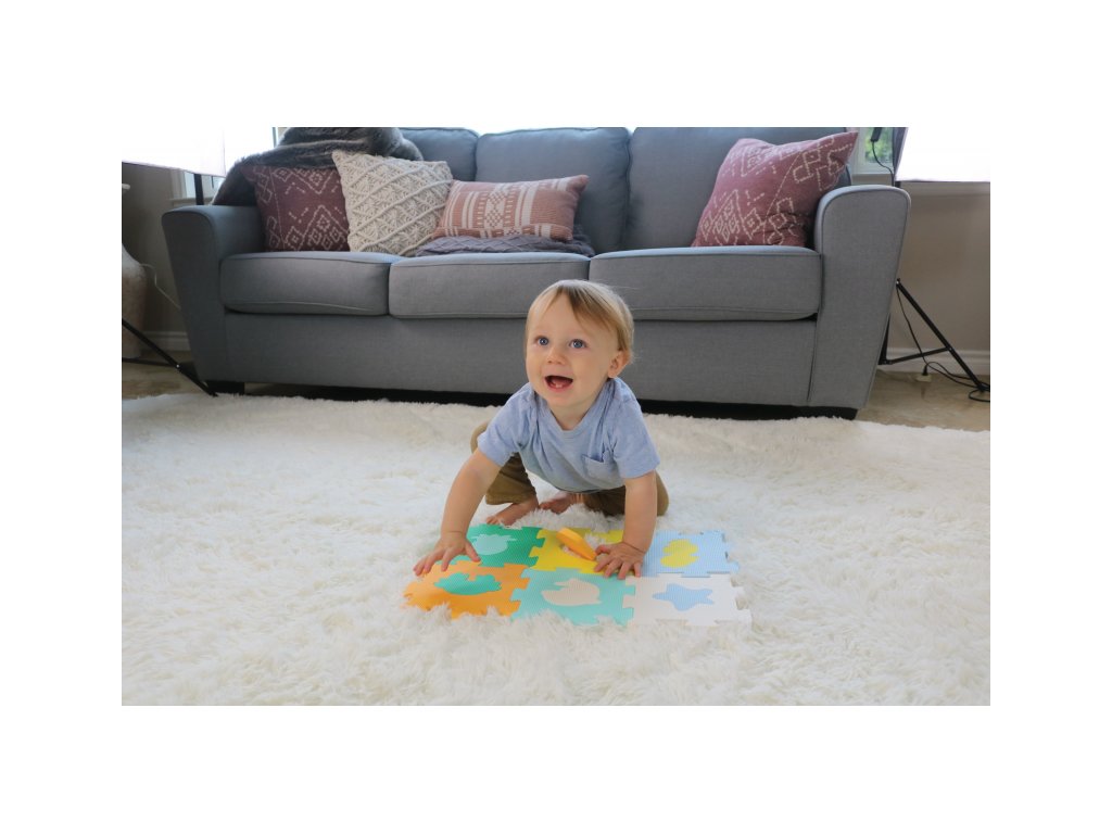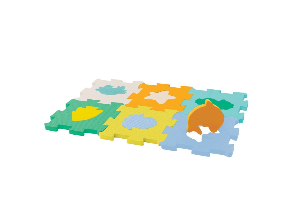 Extra silné penové puzzle vytvára bezpečné a mäkké miesto na hranie detí. Každý zo šiestich dielov má inú farbu a obsahuje vložený tvar alebo zvieratko.