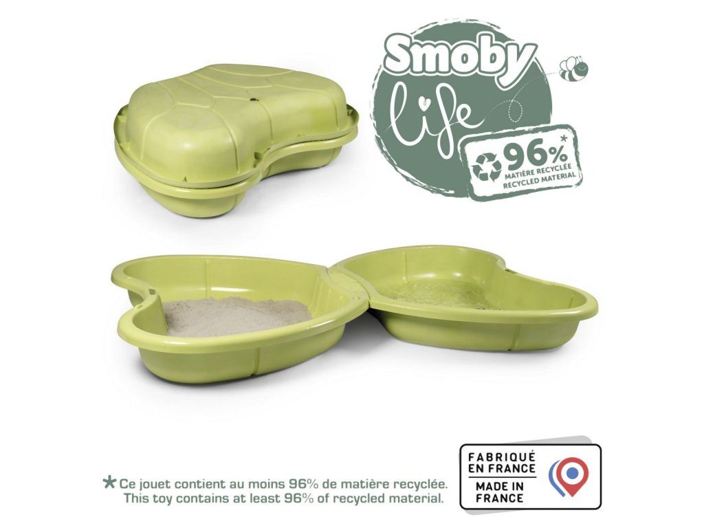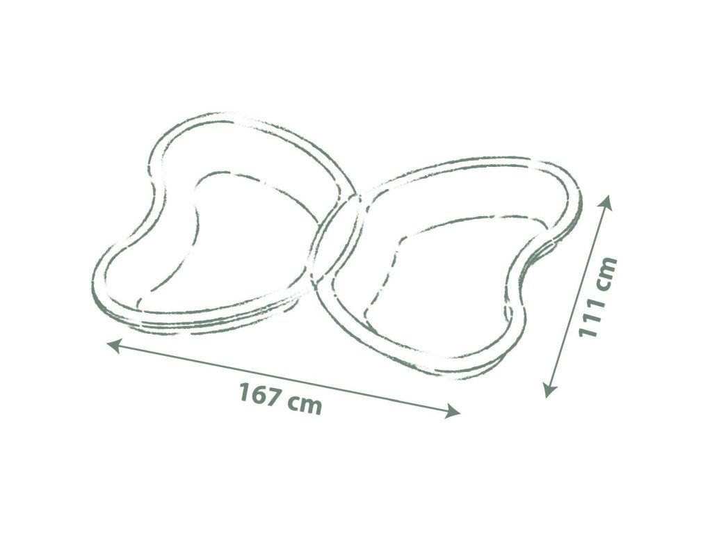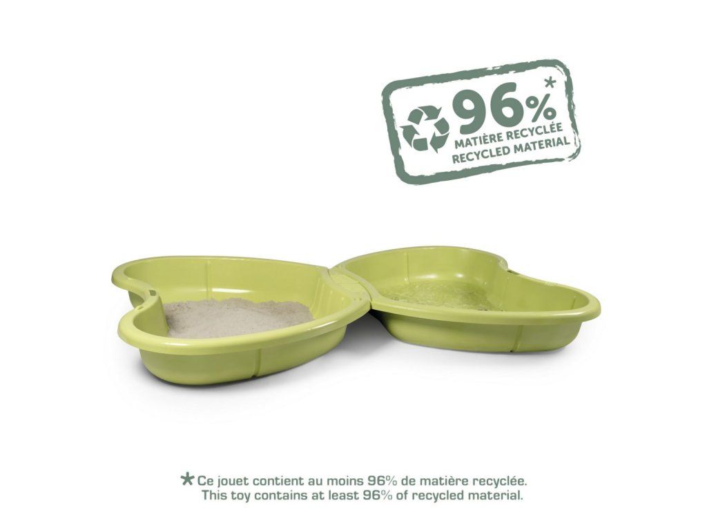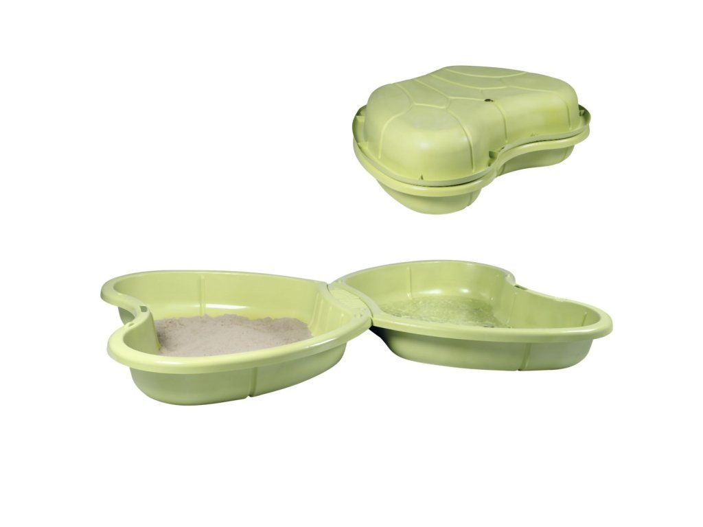 Zelené pieskovisko v tvare motýľa skladajúce sa z dvoch do zebe zapadajúcich častí. Jedna časť môže byť naplnená pieskom a druhá vodou. K vodnej tryske v prostrednej časti môže byť pripojená záhradná hadica. Na pohodlné vypustenie vody z nádoby slúži vypúšťacia zátka. Plastové diely sú ošetrené anti-UV, čo zaisťuje dobrú odolnosť a stálosť farieb v priebehu času. Tento výrobok obsahuje minimálne 96% recyklovaného materiálu. Rozmery rozloženého pieskoviska (DxŠxV): 167 x 111 x 18 cm.Dodatočné parametre