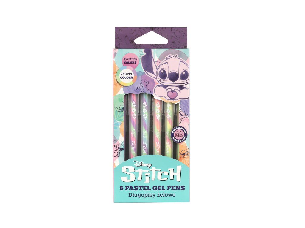 Gélové perá Stitch Pastel 6 ks Dokonalý doplnok do peračníka každého školáka Dodajte svojim poznámkam, denníku alebo kreatívnym projektom poriadnu dávku štýlu a farieb! Gélové perá Stitch Pastel sú dokonalou kombináciou funkčnosti a dizajnu. Sada obsahuje 6 pier v jemných pastelových odtieňoch s motívom obľúbeného Stitcha. Ich hladké písanie a intenzívne farby premenia každú stránku na umelecké dielo. Ideálne do školy, na písanie, kreslenie či vyfarbovanie. S kvalitným atramentom, praktickou sklopnou krytkou a hrúbkou 1 mm je každé pero radosť používať.Dodatočné parametre