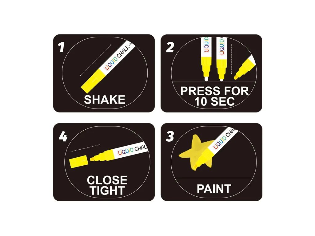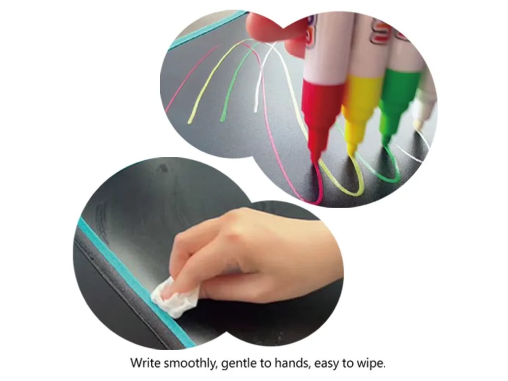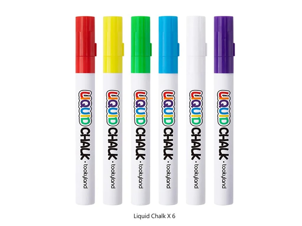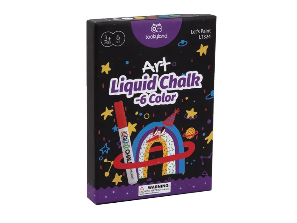 Kriedové fixky 6 farieb Jednoduché kreslenie na tabuľu bez prachu Deti budů mať radosť z kreslenia kriedami v interiéri. Kriedové fixky od Tookyland v 6 sýtych farbách krásne kreslia nielen na tabuľu, ale aj na sklenený povrch. Nezanechávajú žiadny prach a jednoducho sa z povrchu zase zmyjú. S tekutou kriedou ale môžete kresliť aj na pevný papier a ozdobiť tak napríklad zabalené darčeky rôznymi personalizovanými obrázkami.Výrazné farby deti potešia Balenie obsahuje 6 kriedových fixiek, ktoré deťom úplne postačia, aby sa mohli umelecky vyjadriť. Tekutá krieda od Tookyland nie je toxická a pre vaše deti úplne bezpečná. Kresliť s nimi môžu pokojne už deti od 2 rokov.Upozornenie: fixy sú určené na kreslenie na tabuľu, nie na povrchy imitujúce tabuľové povrchy (napr. tabuľové tapety na stenu či tabuľový náter na stenu).Dodatočné parametre