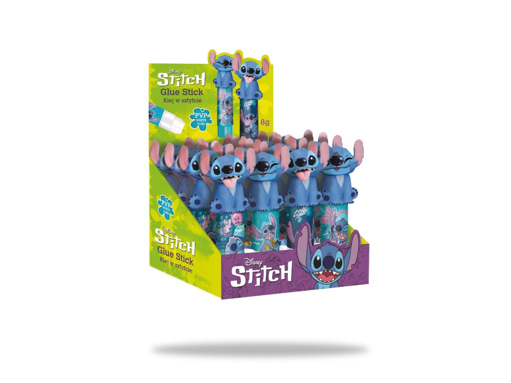 Lepiaca tyčinka Stitch Blue 1 ks Atraktívny obal, vysoká kvalita Lepiaca tyčinka Stitch Blue je súčasťou rozkošnej a pestrej kolekcie inšpirovanej obľúbeným príbehom od Disney o mimozemskom zvieratku menom Stitch. Tento originálny školský doplnok zaujme deti aj dospelých svojím dizajnovým vrchnáčikom v tvare Stitcha – dostupným v dvoch variantoch. Tuhé PVP lepidlo s praktickým vysúvacím mechanizmom má vynikajúcu priľnavosť a je ideálne na papier, kartón aj fotografie. Vďaka veľkosti 8 g sa perfektne zmestí do peračníka alebo školskej tašky. Po zaschnutí zostáva lepidlo transparentné.Dodatočné parametre