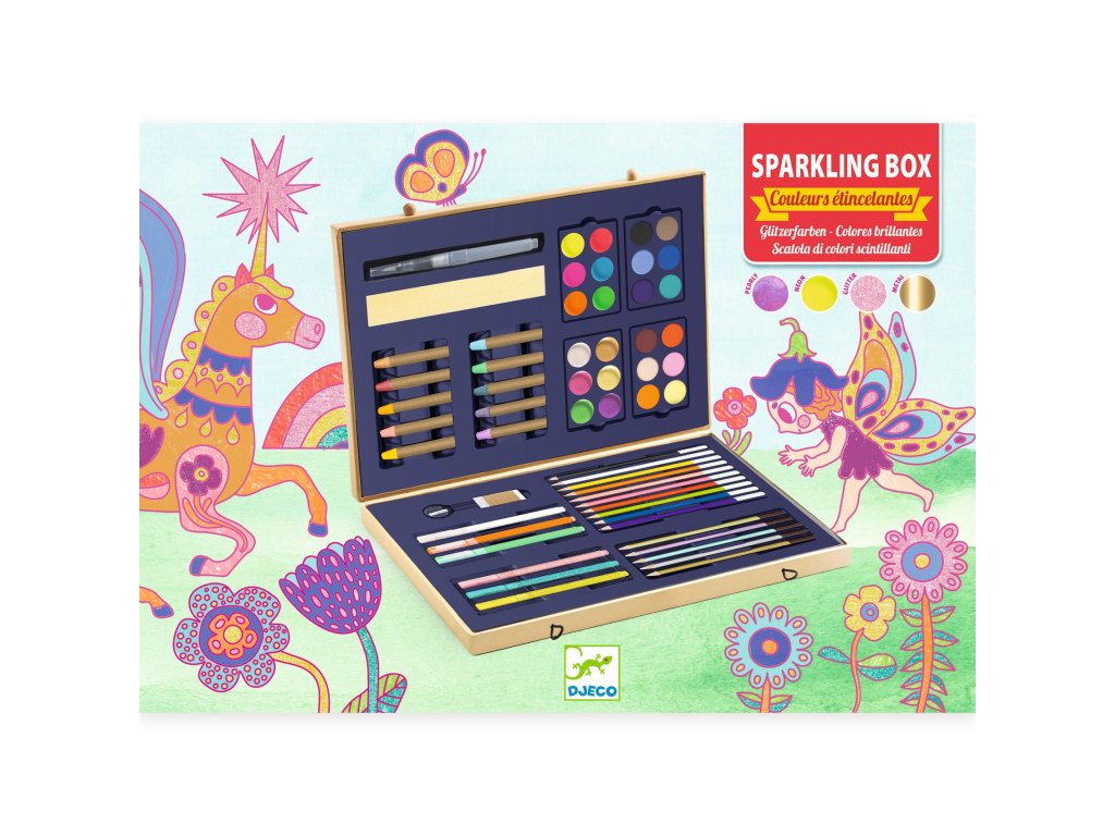 Trblietavý výtvarný kufrík s obalom na vyfarbenieKreatívna výtvarná sada s trblietavými a metalickými farbami v kufríkuTrblietavý výtvarný kufrík s obalom na vyfarbenie je úžasná kreatívna sada pre deti, ktorá kombinuje výtvarné potreby v praktickom kufríku s možnosťou vyfarbiť si vlastný obal podľa fantázie. Kufrík obsahuje rôzne typy farieb vrátane trblietavých, perleťových, metalických aj klasických gvašových farieb, ďalej má pastelky, farebné fixky, štetec s nádržkou na vodu, špongiu, strúhadlo a gumu, takže deti môžu kresliť, maľovať aj kombinovať techniky. Kufrík slúži zároveň ako úložný priestor pre všetky výtvarné pomôcky a motivuje deti k dlhšej kreatívnej hre aj tvorbe.Prečo si vybrať tento kreatívny kufrík od Djecovhodný pre deti od 6 rokovobsahuje rôzne typy farieb a dekoratívne médiámožnosť vyfarbiť si obal kufríka podľa vlastnej fantáziekvalitné výtvarné pomôcky pre kreslenie, maľovanie a kresbupraktický prenosný kufrík s priestorom na uloženie potriebideálny darček pre kreatívne deti aj umelcov začiatkovČo sada rozvíja u detíkreativitu a fantáziu pri tvorbe obrázkov a dizajnovjemnú motoriku pri manipulácii s farbami a nástrojmischopnosť kombinovať rôzne výtvarné technikytrpezlivosť pri dotváraní dielzmysel pre farby, kompozíciu a sebavyjadrenieObsah baleniakufrík s výtvarnými potrebami:10 akvarelových pasteliek1 štetec s nádržkou na vodu1 špongia6 neónových gvašových farieb6 perleťových gvašových farieb12 klasických gvašových farieb1 strúhadlo1 guma na gumovanie10 farbičiek5 farbičiek s metalickým leskom3 farebné popisovače3 trblietkové farebné popisovačeDodatočné parametre